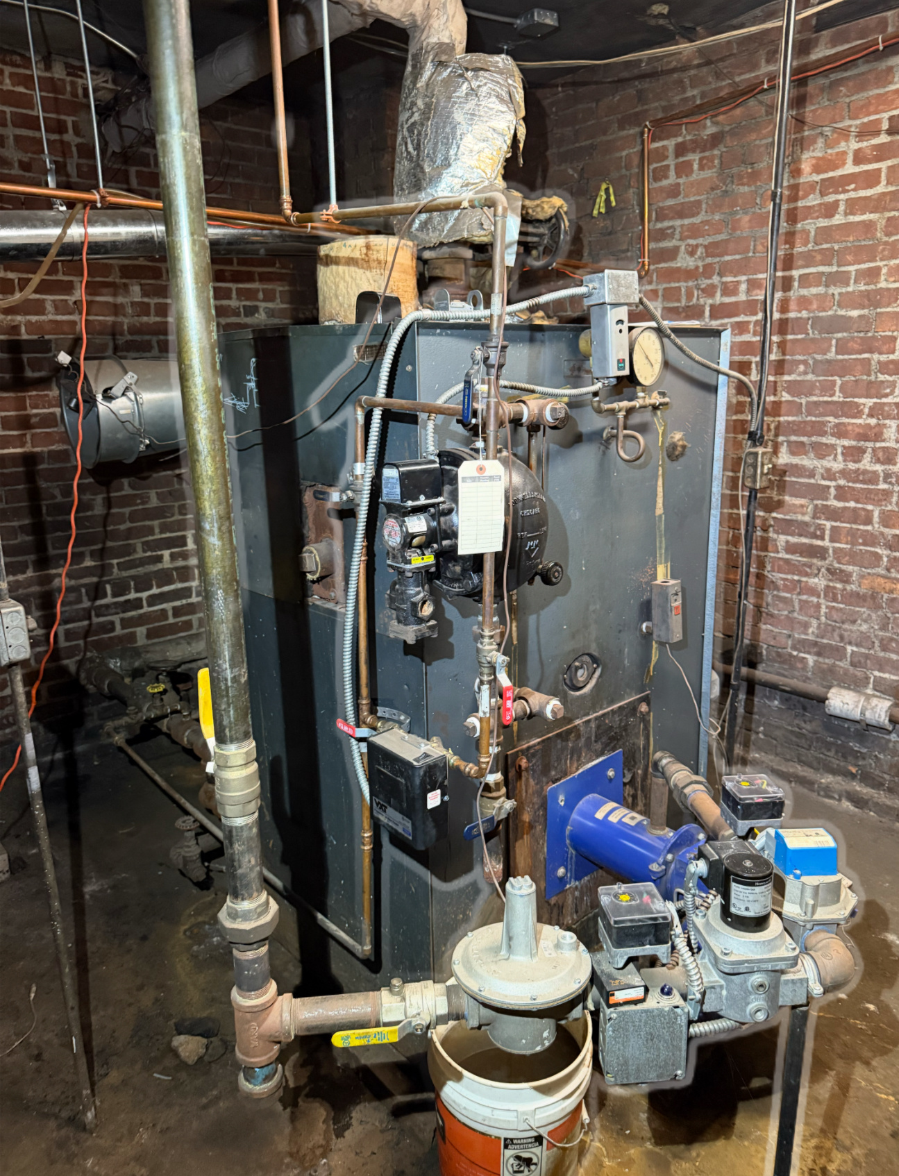 The current boiler: It's a Goliath. No header, equalizer, Hartford. Looks like 1980's. Sadly, the LL told me he got a quote that from the same 'well known' boiler installer that installed this one, (Company out of the in Springfield area), and they were going to install a new boiler (same size), connecting to existing piping (like, still no header, equalizer, Hartford). Same BTU, re-use the same giant 601 series gas Burner (700,000 to 1,500,000 Btuh)