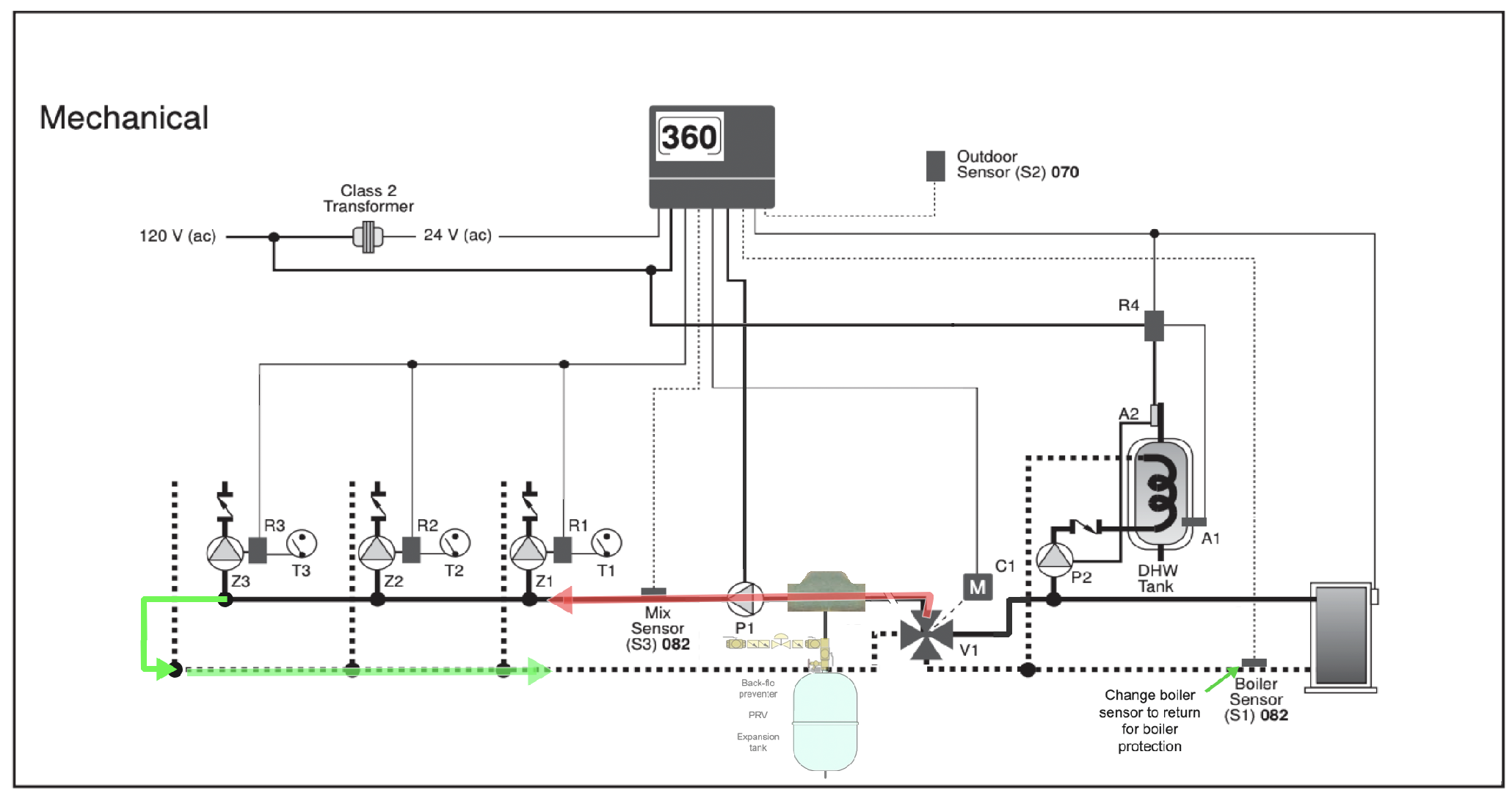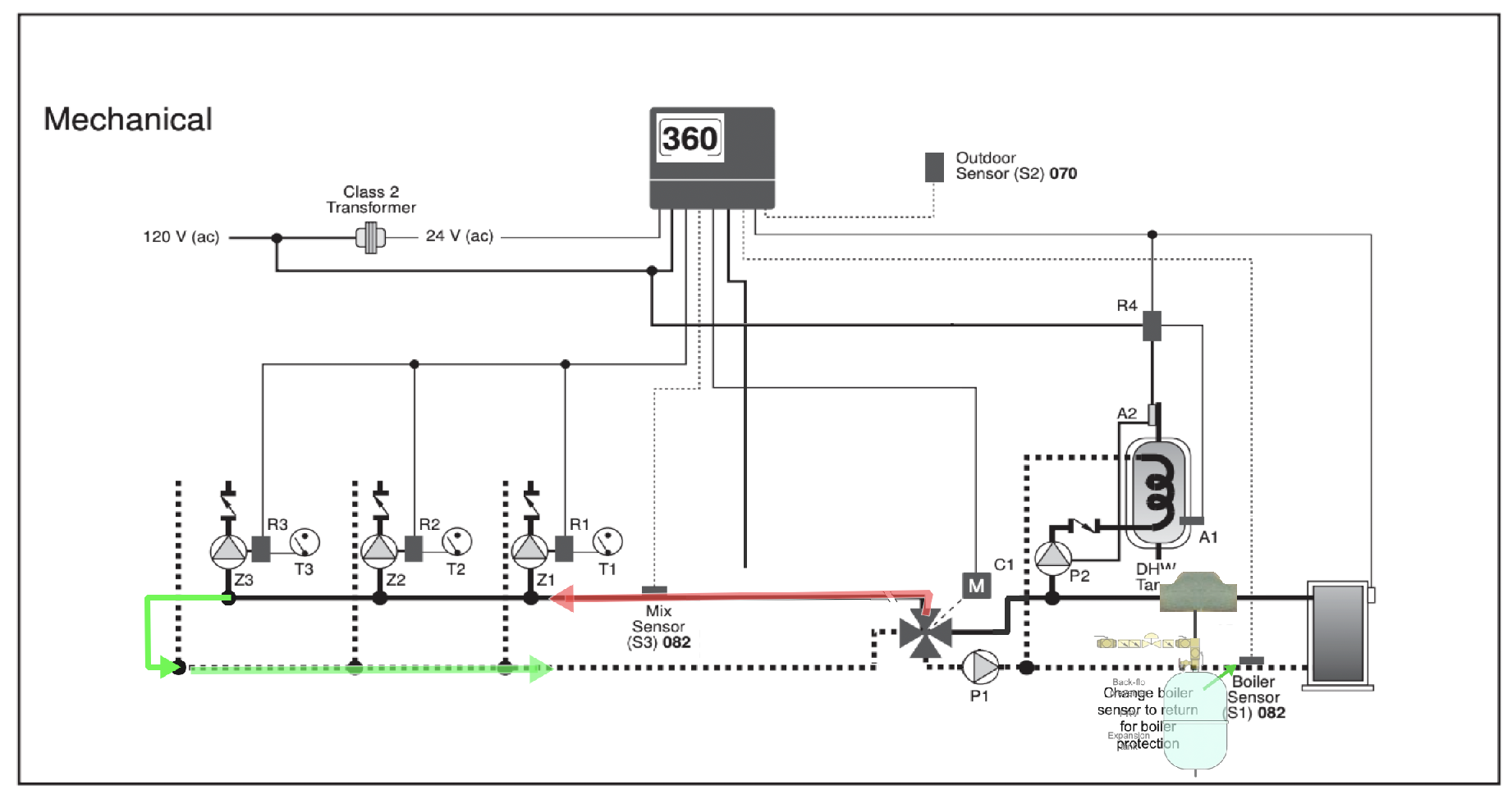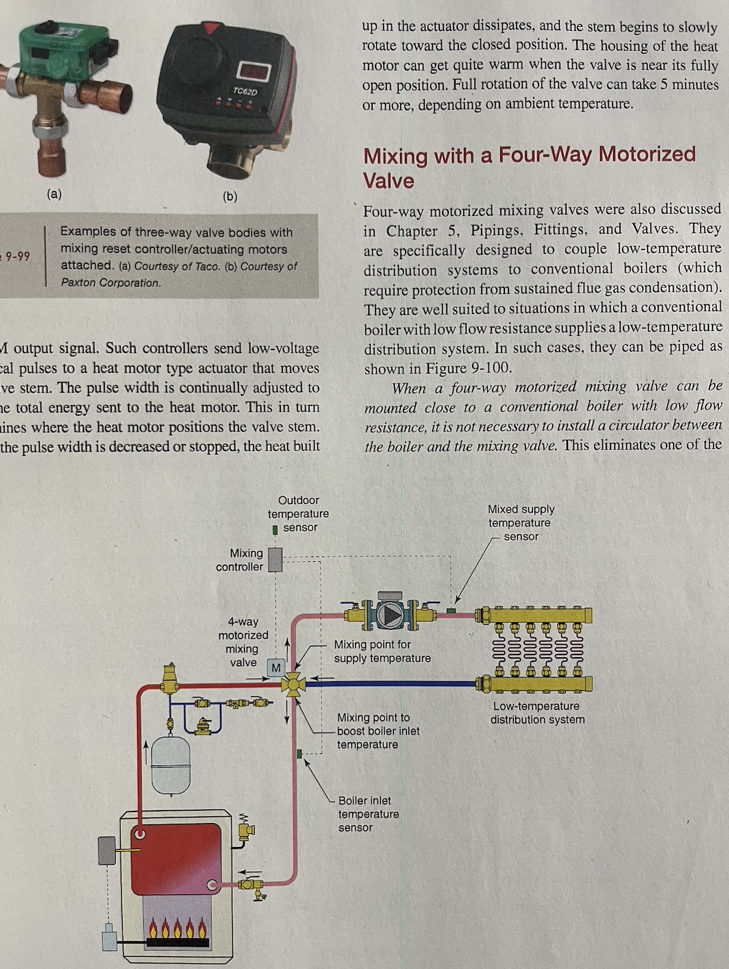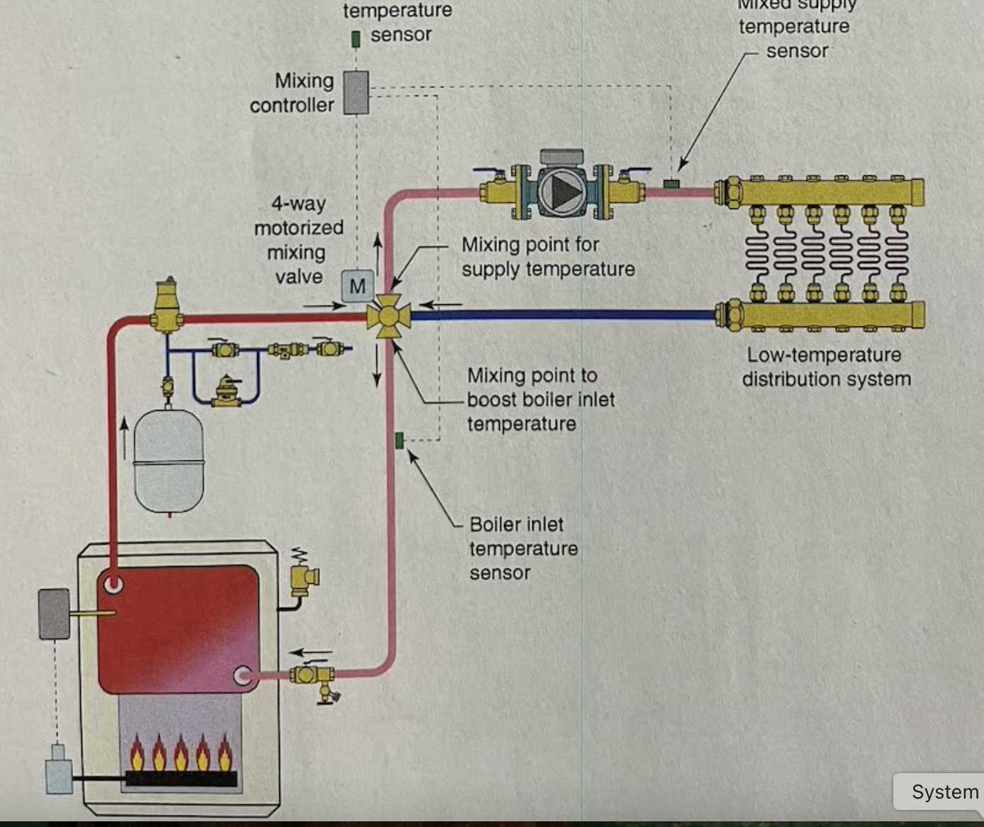 There is no clear definition for adding that additional P-1 pump. Which I see in series with the 3 zone pumps, essentially doubling the head. I suppose adjusting the manifold valve regardless. This talks about the addition pump in the boiler loop, I think the same applies to the secondary, or mixes side of the valve.