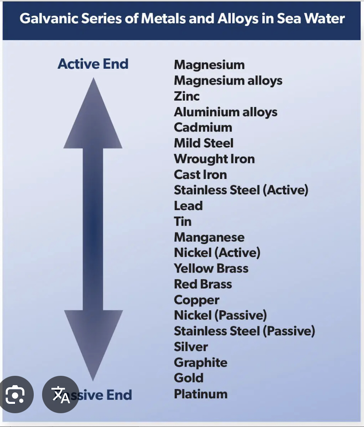 We see steel, iron, brass and alloys, stainless, maybe multiple grades, aluminum alloys in some case, zinc, and copper. These all fall on different locations on the galvanic series tables. Aluminum and copper for example.