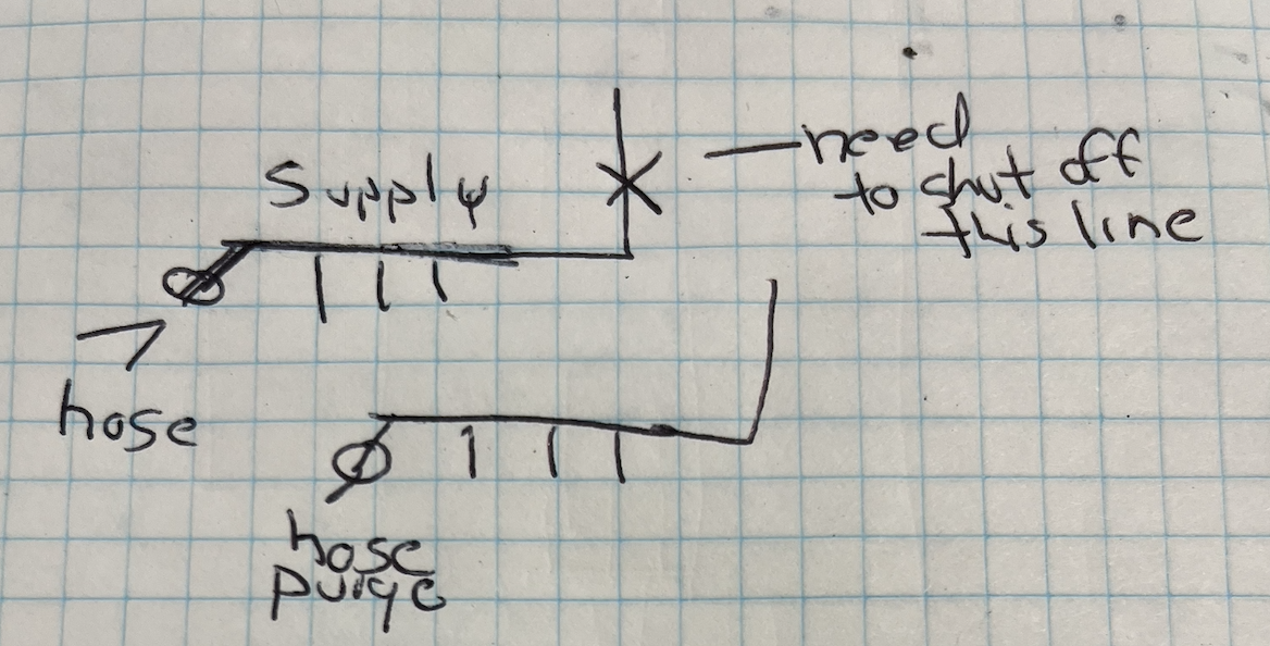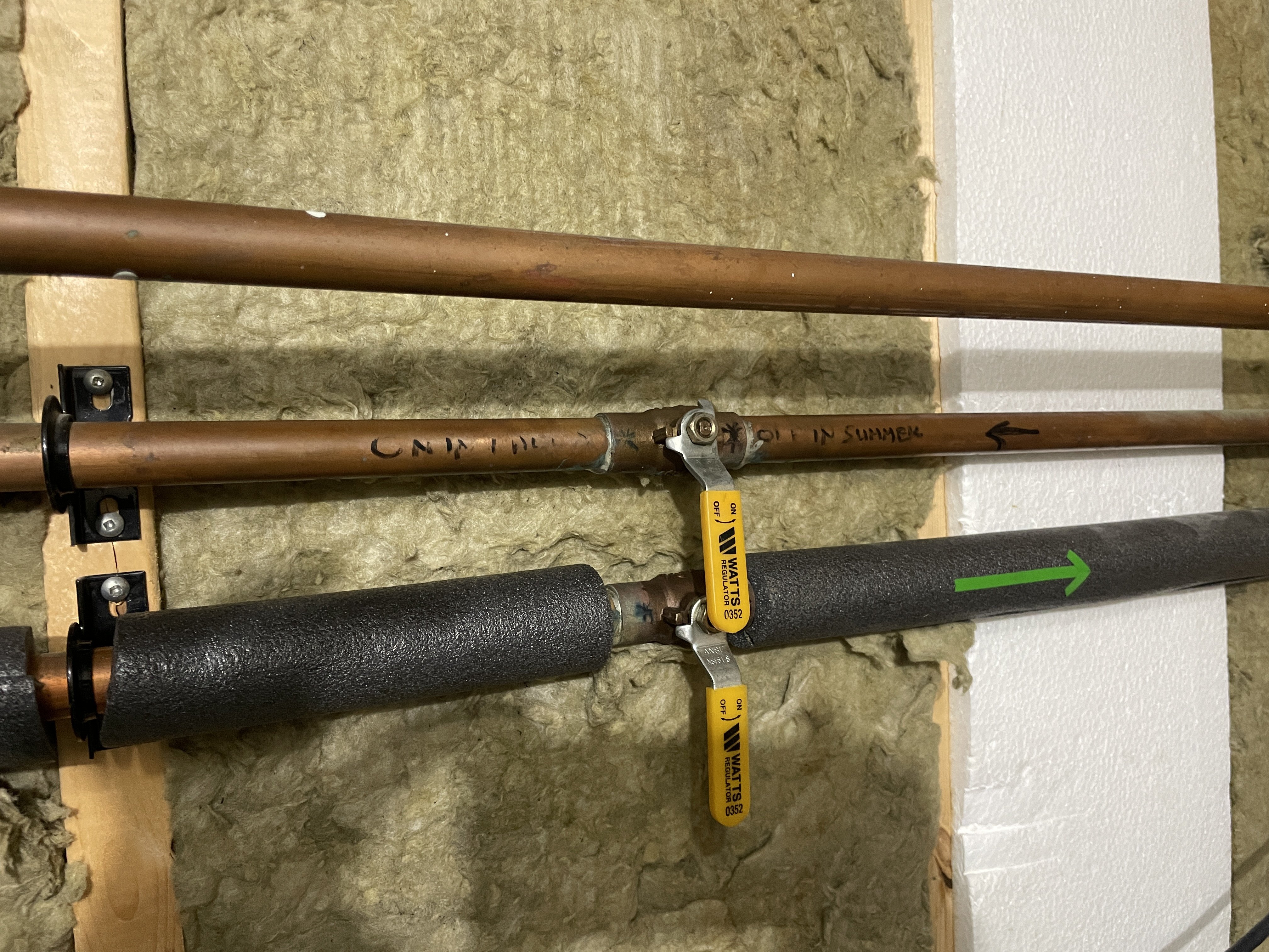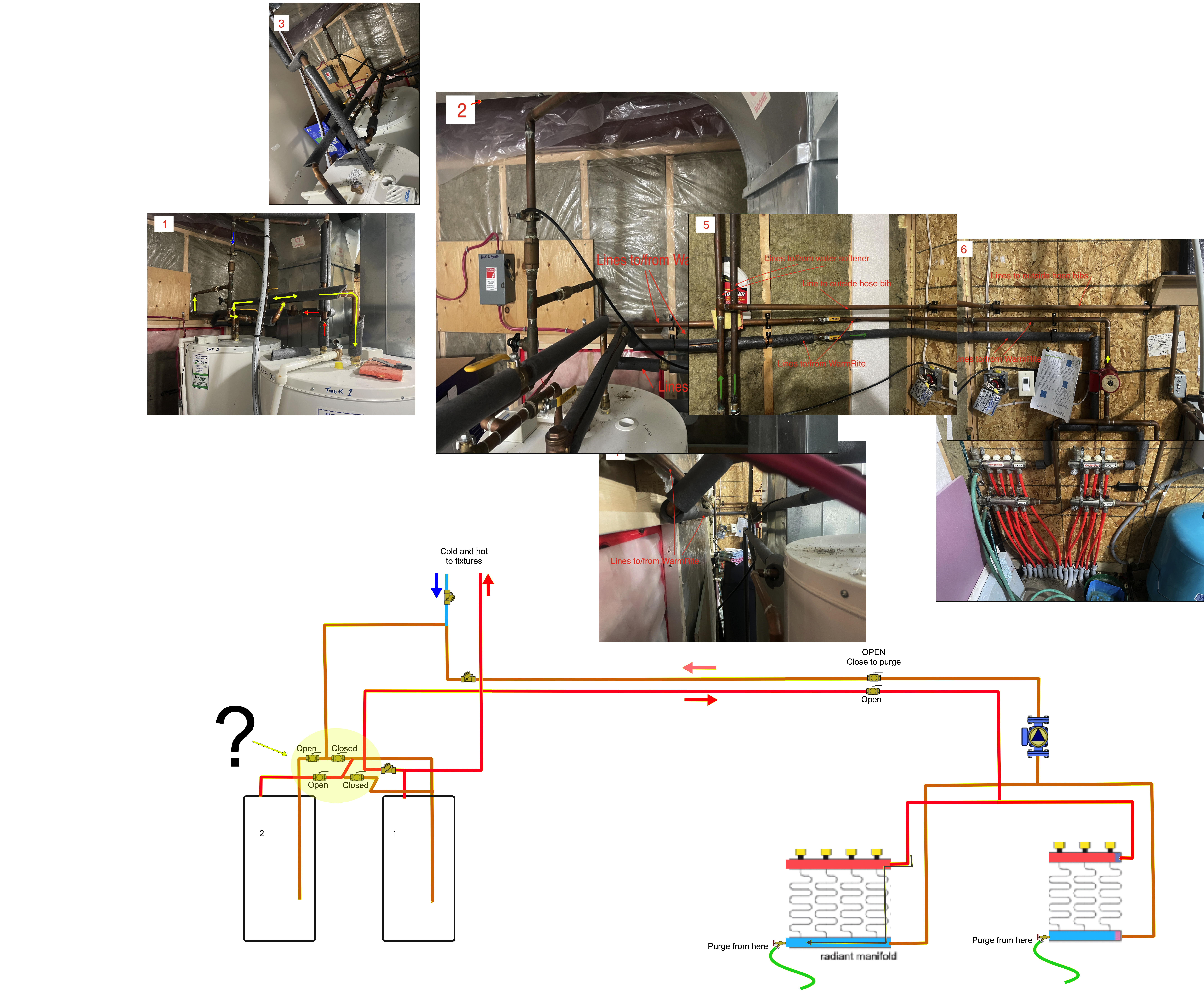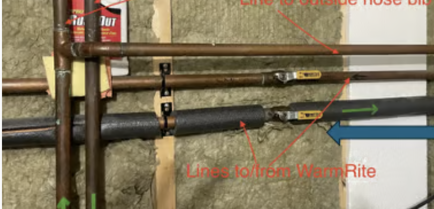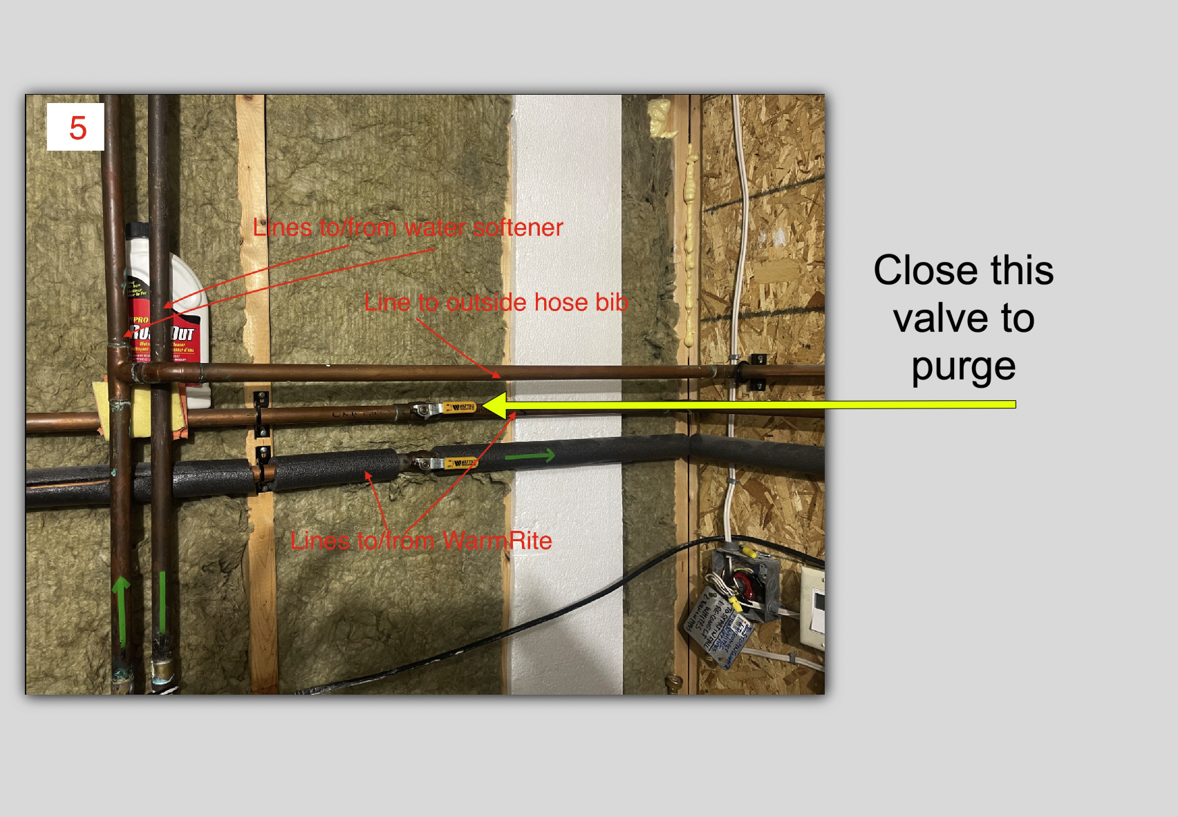 The photos show the system layout… I have it set up to do a purge/refill this aft so that is why the green hoses are connected (dark green feed line into return valve from cold water potable supply; light green drain line from supply vale per the WarmRite instruction manual).
