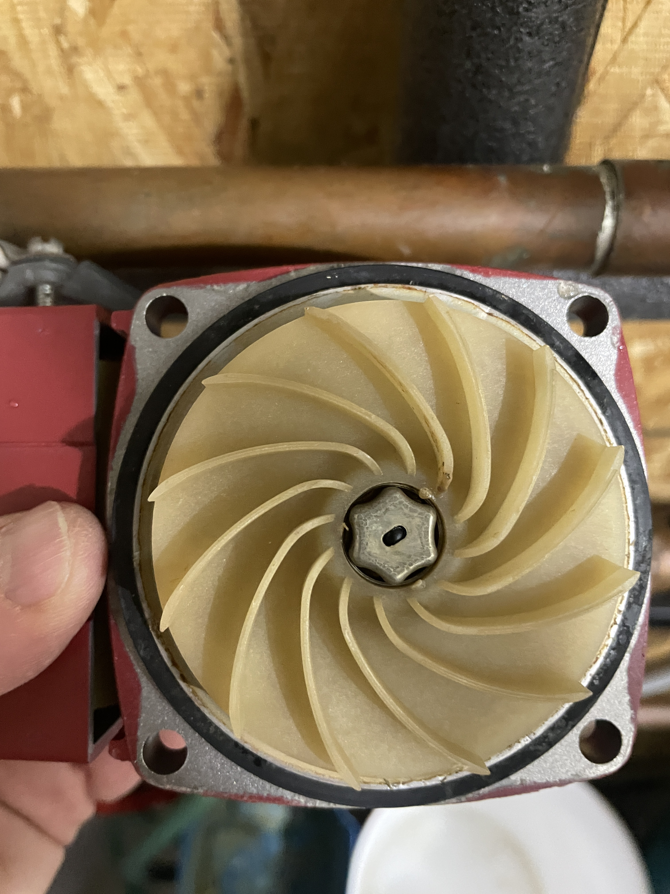 Not too much water drained from impeller when I removed it; no isolation valves but I drained the manifold before taking the pump apart. Impeller spun freely and seemed nice and clean. No strainers that I identified; all valves open (though I have closed all as well); HW tank is definitely suppling hot water (when draining from return line into flow drain, get fresh flow of hot water). Pump is warm to touch when running. No pressure value to indicate pressure before or after pump; only indications are flow meters on each line.