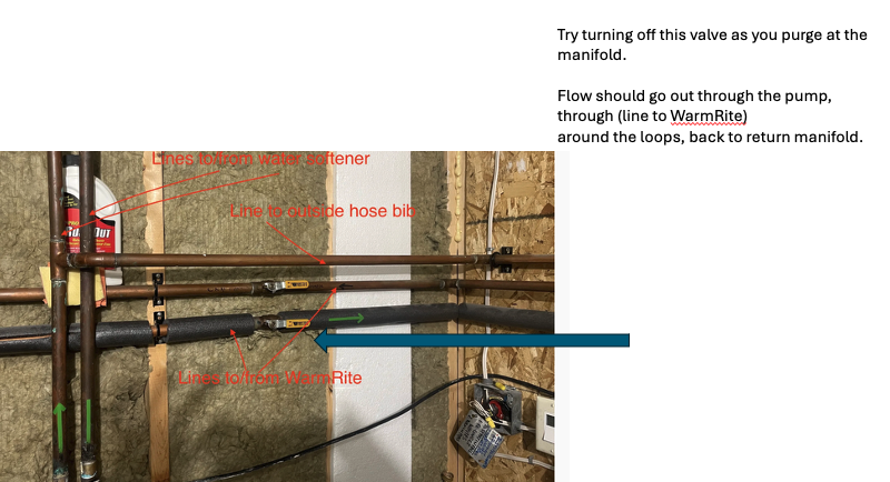 I had the feed (hot water) line off during purging; I supplied water directly from the well instead of using hot water, since I was discharging to the floor drain. I have tried purging with the return line both open and closed, but on my next attempt will follow the procedure in the WarmRite manual - add feed water through the return port on the manifold, and discharge through the supply port on the manifold, while keeping the main return line open after the pump, and will go loop by loop. The one drawback of this is that the individual flow meters don't register flow (assume they are uni-directional?).