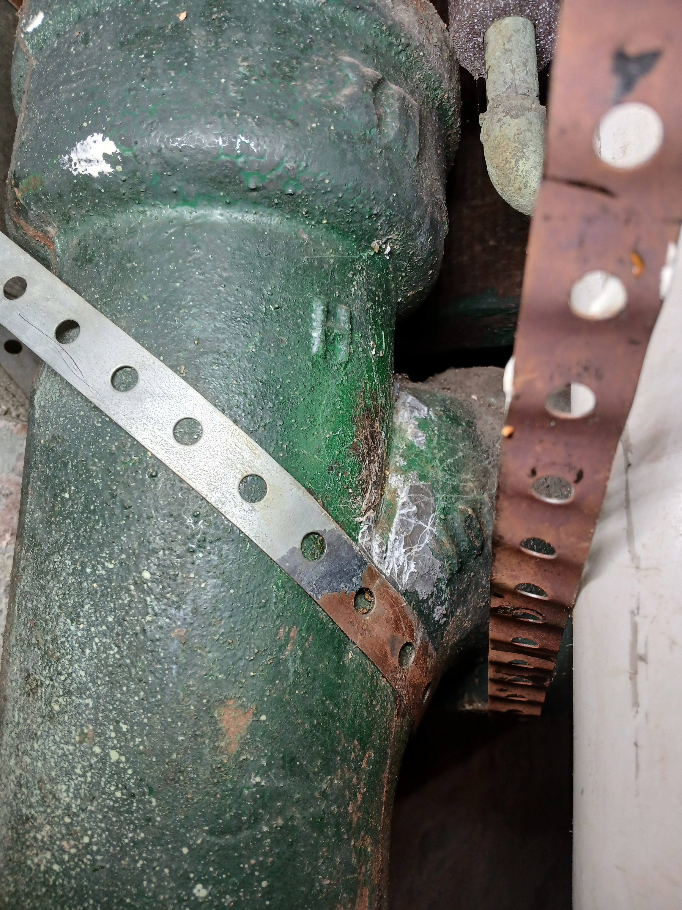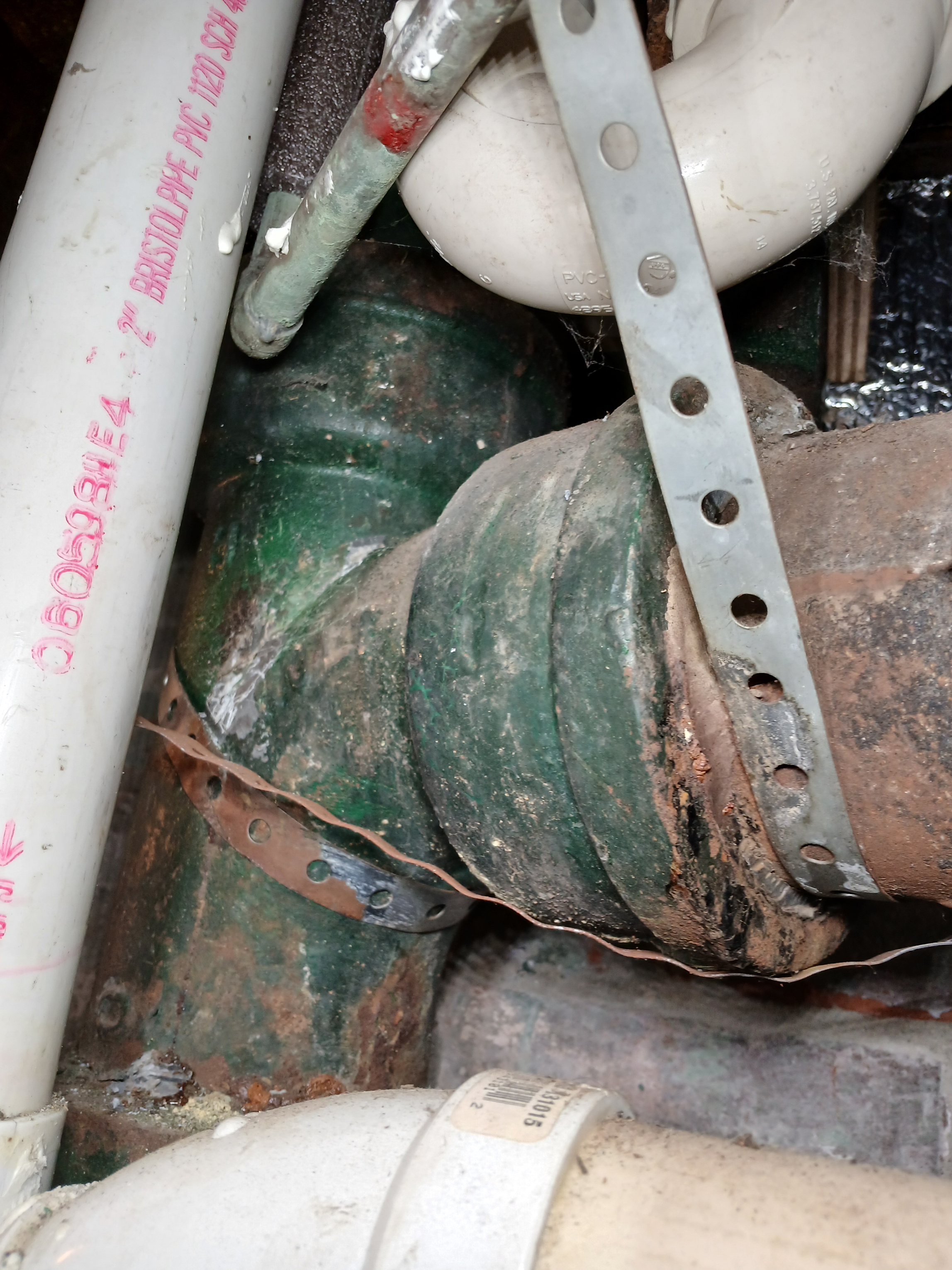 This pipe (Green) is vertical and there is a toilet connected not too far away. The problem I noticed was a rusting strap. I did clean the pipe with a wire brush and thought an epoxy would stop the leak. NOT A CHANCE. I removed the epoxy and then took these pictures today.