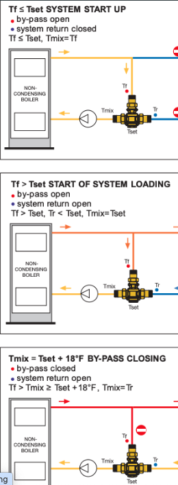 A boiler return valve would just bypass a portion, maybe all the boiler output back to the boiler until it reaches the protection valves temperature, let say 130. Then it starts allowing flow to the distribution. So the boiler always protects itself first, then starts slipping flow to the system. Obviously the boiler needs to runabove 130 to return 130. So the tekmar setting needs to accomodate that.