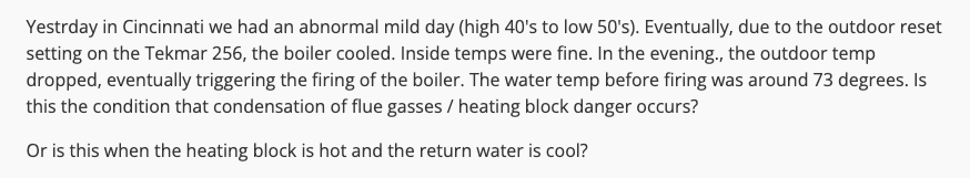Yestrday in Cincinnati we had an abnormal mild day (high 40's to low 50's). Eventually, due to the outdoor reset setting on the Tekmar 256, the boiler cooled. Inside temps were fine. In the evening., the outdoor temp dropped, eventually triggering the firing of the boiler. The water temp before firing was around 73 degrees. Is this the condition that condensation of flue gasses / heating block danger occurs?