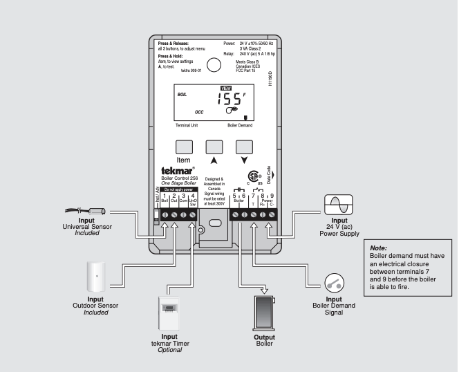 One typical control strategy is, thermostat calls on zone pump or circulator via a relay box. The relay box sends power to the tekmar #7&9 to wake up. It looks at OD and will fire if below the WWSD. With the 256 the boiler loop pump wire through the aquastat control on the boiler itself. There is no boiler pump connection on the 256. Where did you locate the sensor that is connected to #1 &3?