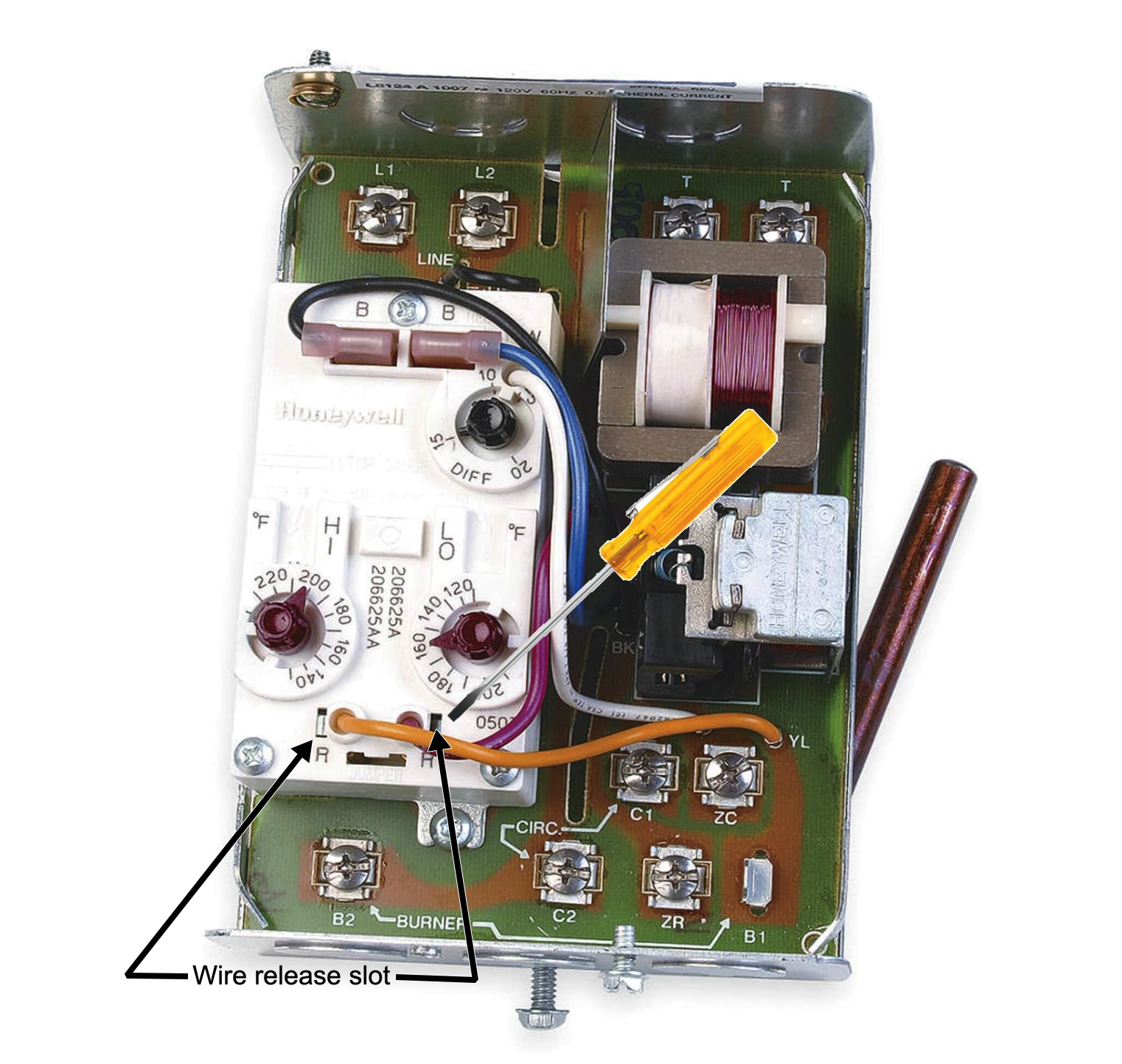 To remove the wire from the white aquastat: use a pocket screwdriver to depress the release and the wire will pull right out.  the small rectangle next to the wire opening is the release.