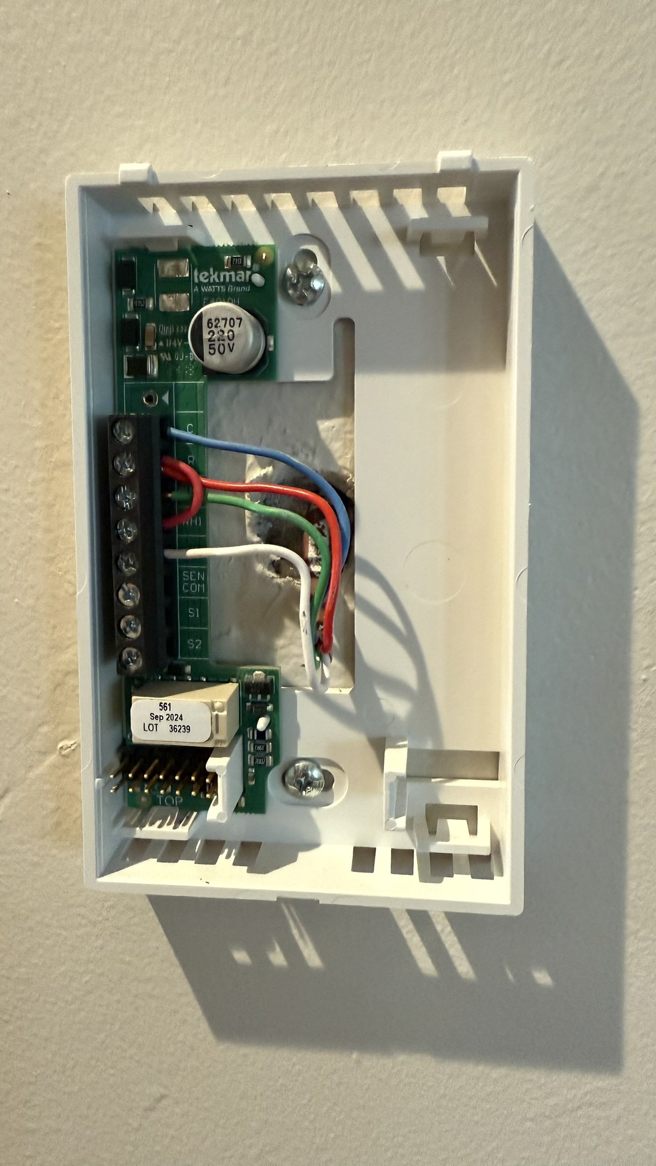 Hey there, new home in CO, radiant floor heat with 6 zones (great room/kitchen, master bed, 3 additional beds, and garage). Our HVAC guy installed the Tekmar 561 in the living area with Tekmar 518's in the rest of the rooms. Pretty sure there aren't any floor sensors, just air sensors (based on the wiring of the 561 attached). The Watts/Tekmar app is pretty lame in my opinion and while it keeps a good connection to the internet via wifi, the IoT (internet of things) which connects our phones to the thermostat regularly drops connections and the stat needs to physically be messed with to reconnect. We travel and want to be able to have reliable connection from our phones to our home and don't want to have to regularly reconnect/reboot things. We don't need a feature packed smart thermostat which solves all the worlds problems, we just need to be able to easily manage the temps from our phones when we travel. Thinking about the Honeywell Home or Ecobee or even the Amazon smart thermostat. I know the Tekmar is designed/marketed for radiant floor heating, but if we're not using the floor sensor, I should be able to use any 4 wire thermostat, right? And, I assume I'll need 6 new matching stats so I can control each room remotely when we travel, right? Thanks for your help, I appreciate it.