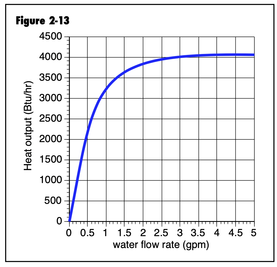 This graph will look the same regardless of the type of heat emitter, obviously these low flow conditions would be a residential system, but even with 50 gpm flows, the curve would look the same. This is the challenge with varying flow to change heat output. Sometimes called a hockey stick curve :)
