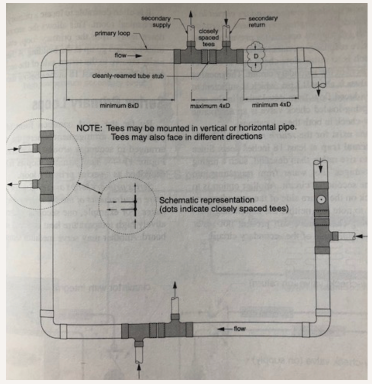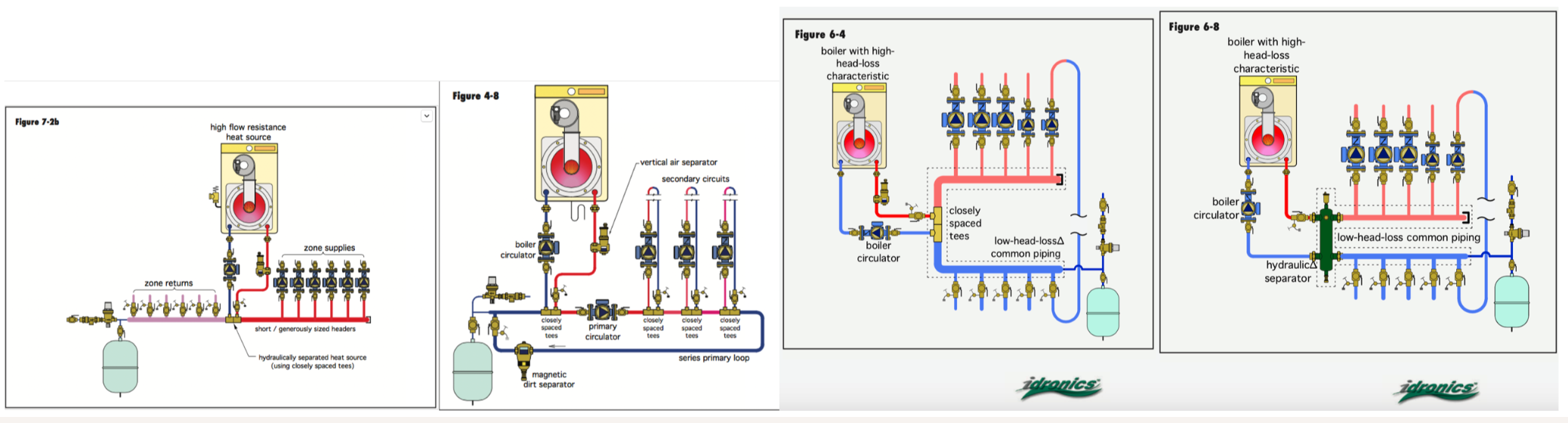 Yes, I am convinced that when flow through the boiler exceeds flow through the building then flow through the common piping gets reversed. All of the return water from the building combines with some of the supply water from the boiler and gets sent back to the boiler, right? And the supply water going to the building is 100% water that just came from the boiler and very close to boiler outlet temperature, right? It’s been years since I read the book that you mentioned, but I recall that the piping in common could have flow in one direction OR the other.