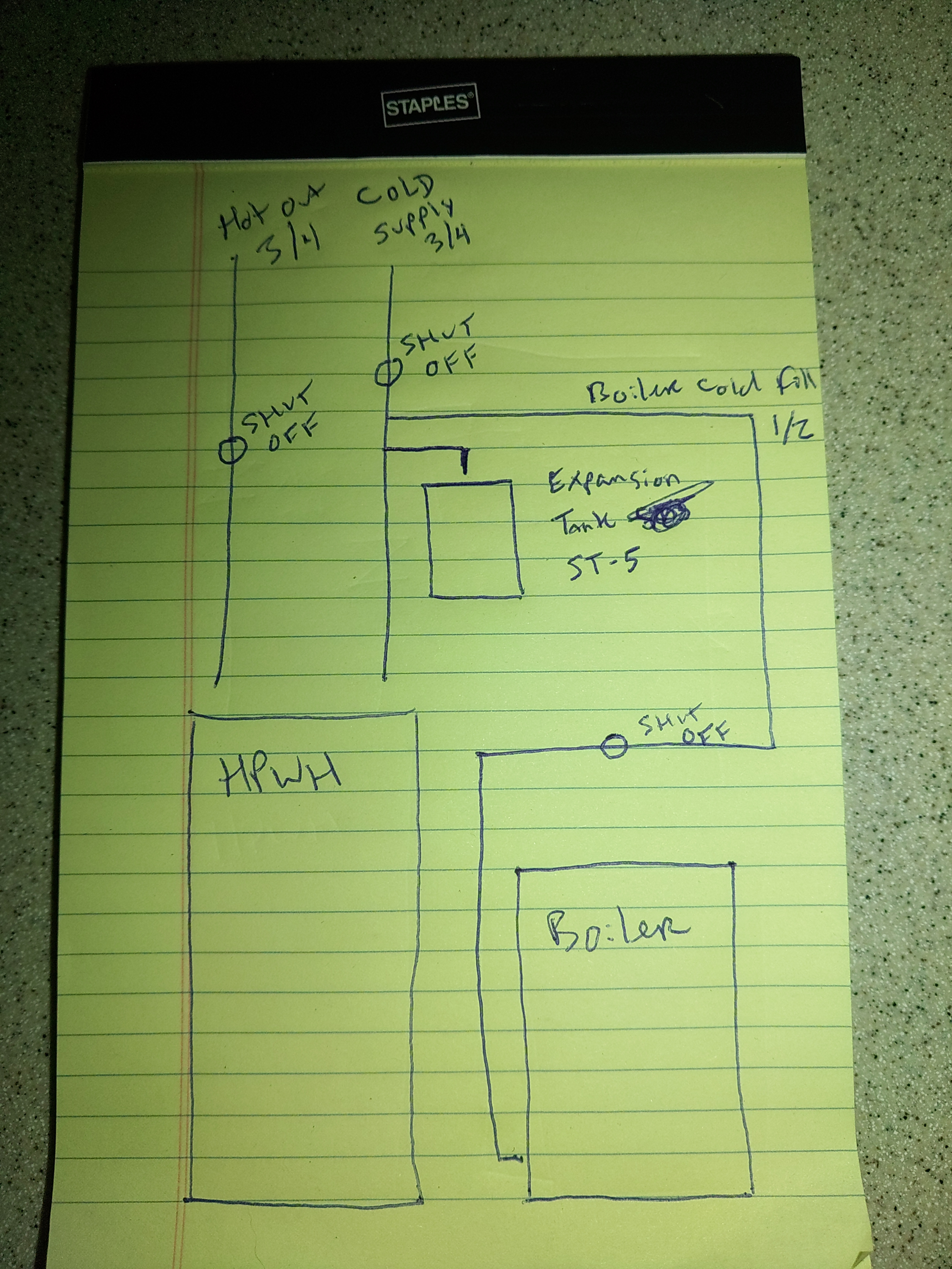 Thanks gents however in the interest of simplicity I'm going to not even include the coil in the piping. Just straight into the HPWH with a tee for the boiler fill and a tee for the expansion tank