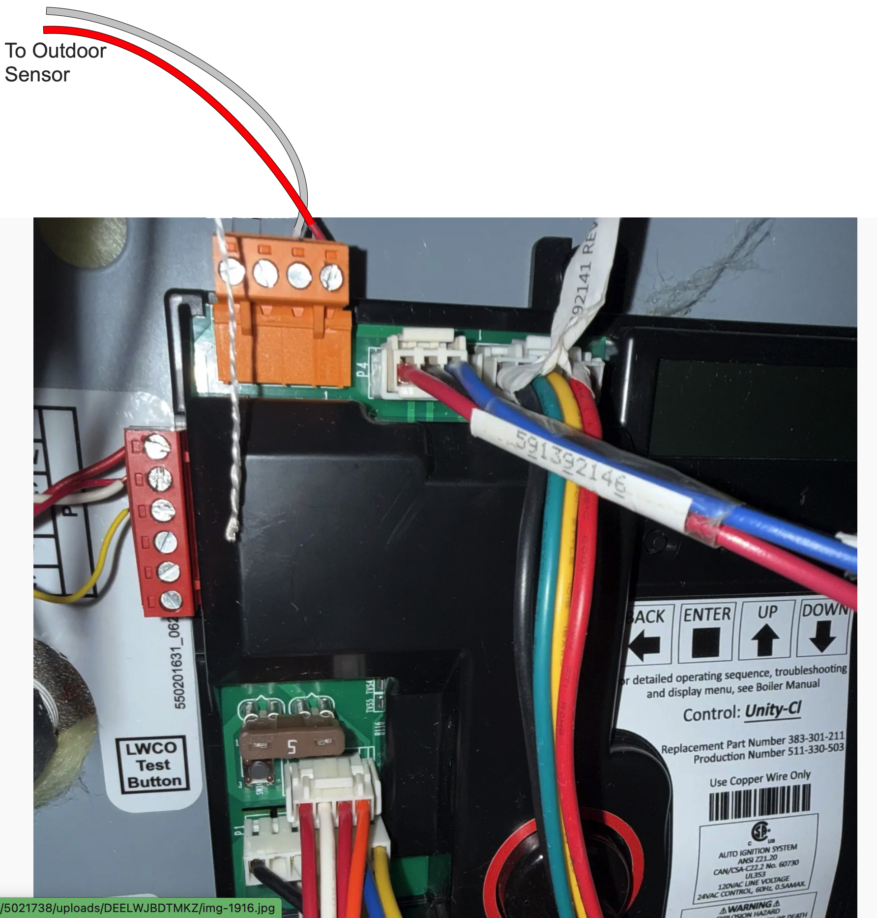 Hello, I am having difficulty finding information on how to connect the Outdoor Temperature Sensor Kit, 381-356-586 to CGa4-PIDN series 3 boiler control unit. There is no drect plug in where I can connect the harness provided with the kit and there are no instructions how to connect it. I have not found any information whether an outdoor reset kit is also reuqired. From what I could find, it would seem I should be able to connect the sensor to the contiol unit directly.