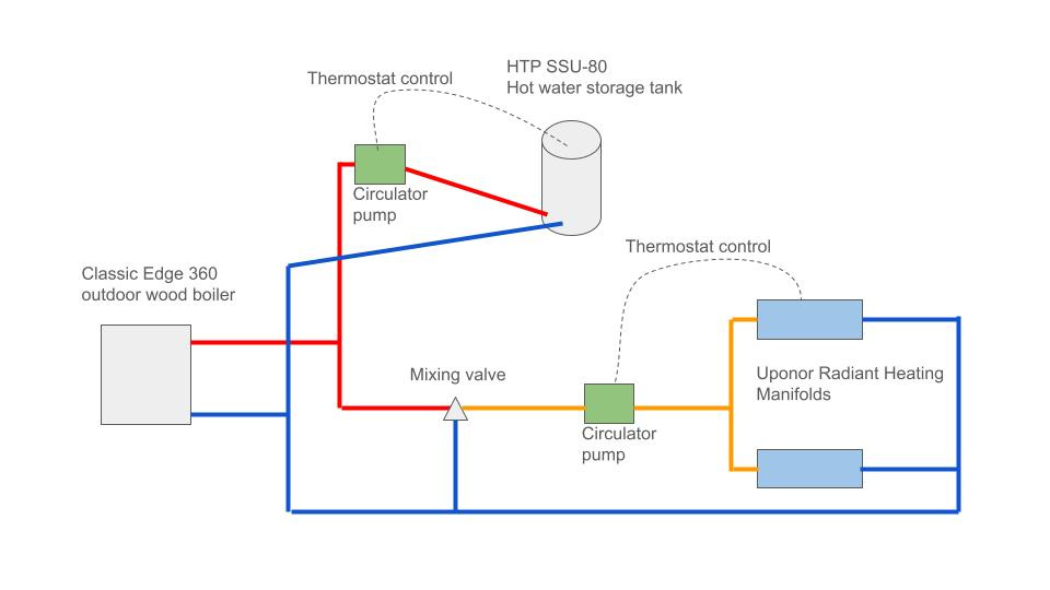 I drew up this diagram for my home heating system. The plan is run the wood boiler year round for hot water production, and in floor radiant heat in the winter. Would this system work? Any advice on changes?