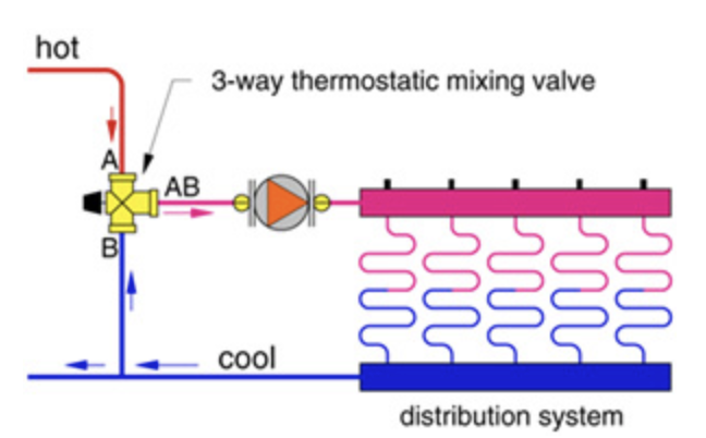 Different piping on 3 way valves. Most thermostatic are a tee shape with mix out the bottom port.