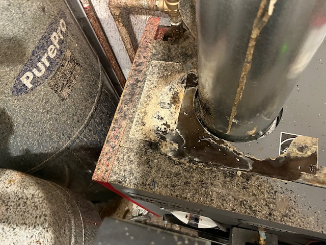 A neighbor had this happen to a new oil boiler installation. It looks like rain water entered the flue pipe from an uncapped chimney. Could the water cause this splatter? Looks like some heat damage near the flue pipe. The boiler is operating normally now. The “splatter” is from the original event and not yet cleaned.