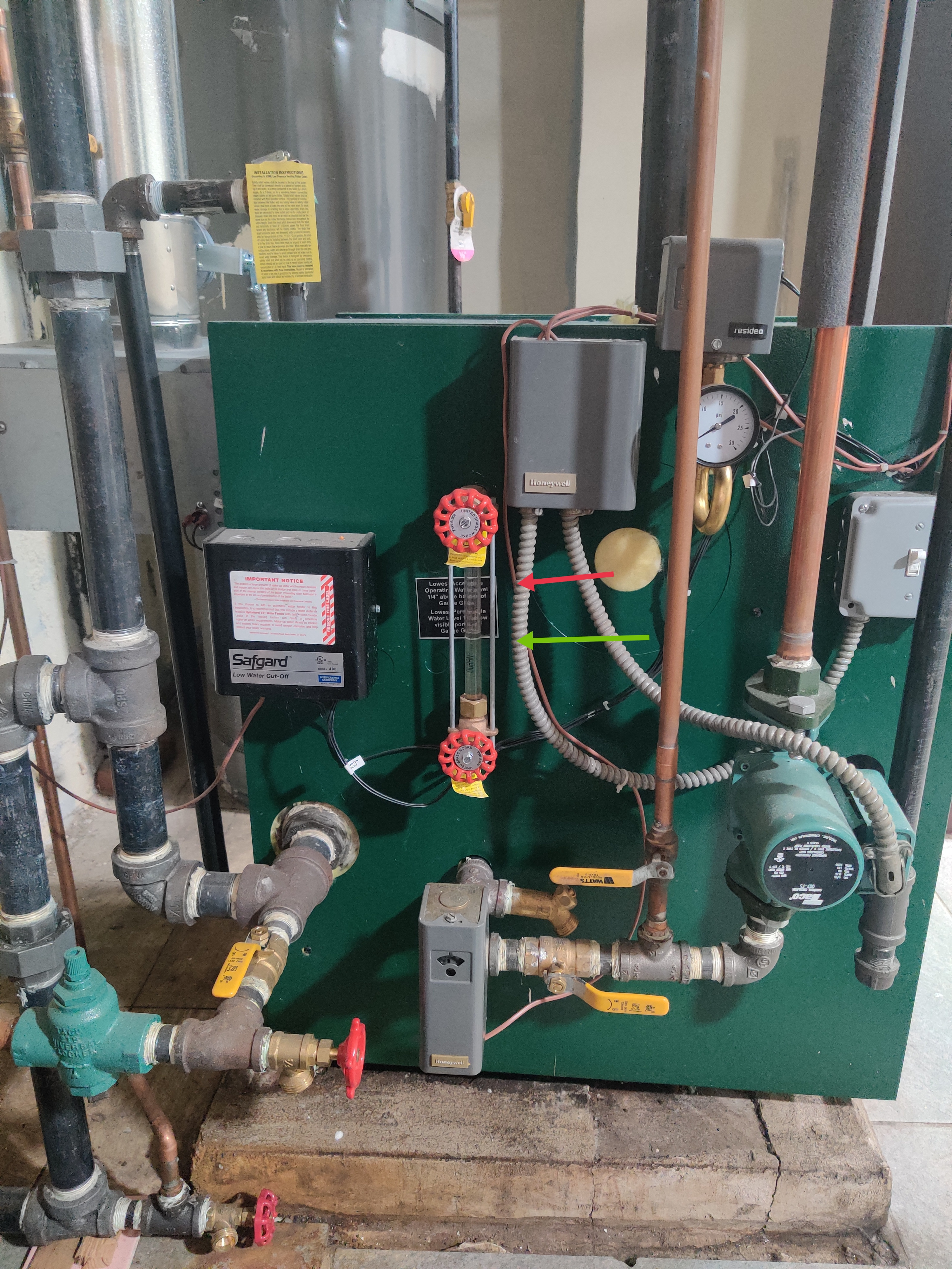 The green arrow is where the water level is when only hot water loop is on, when both are on, water goes up to red arrow. And one strange thing I notice is that even when my hot water loop thermostat is not calling for heat, the second floor pipes are hot when steam is on (hours after the pump stopped running), the pump is not running (I don't feel any vibration), as if the steam is so hot that it somehow causes hot water to flow through the second floor pipes.