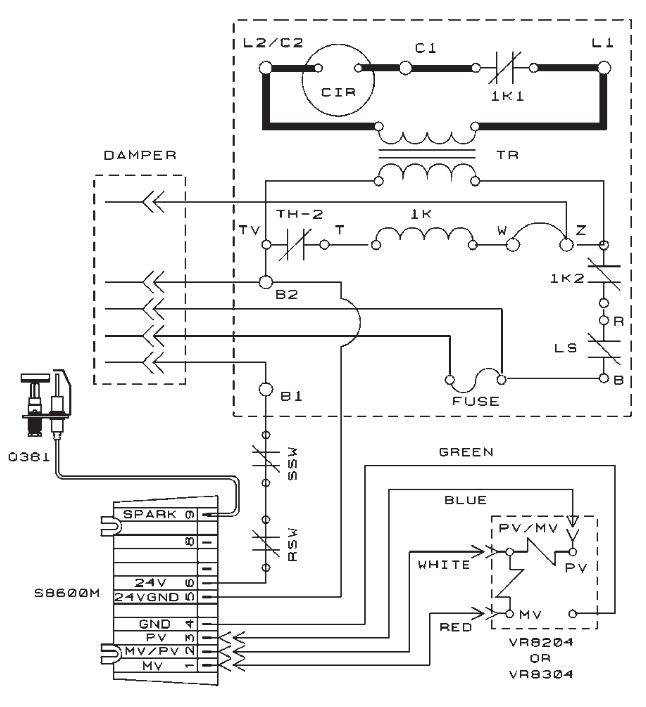 For troubleshooting purposes, I'm trying to explain to my guys that on a no-heat call the damper being open is the first indication there is a call for heat, but it will remain open if the spill switch is activated yet will close if the pressure is satisfied. The included wiring diagram does not support my claim. All the safeties and limits are before the end switch of the damper. Or am I reading this wrong? What goes on inside the damper has always been at the very limits of my electrical comprehension. Power to open, power to close? Whyyyyyy? Can't the damper just spring close like a zone valve?
