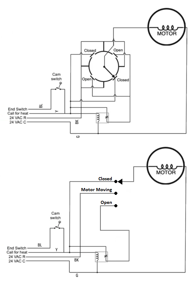 The motor stops at each 90° turn of the motor. 90° to open, 180° to closed, then 270° to open, then 360° = 0° to close. There is constant power needed to operate the motor to close the damper after the call for heat is satisfied. @EBEBRATT-Ed has the correct wiring description
