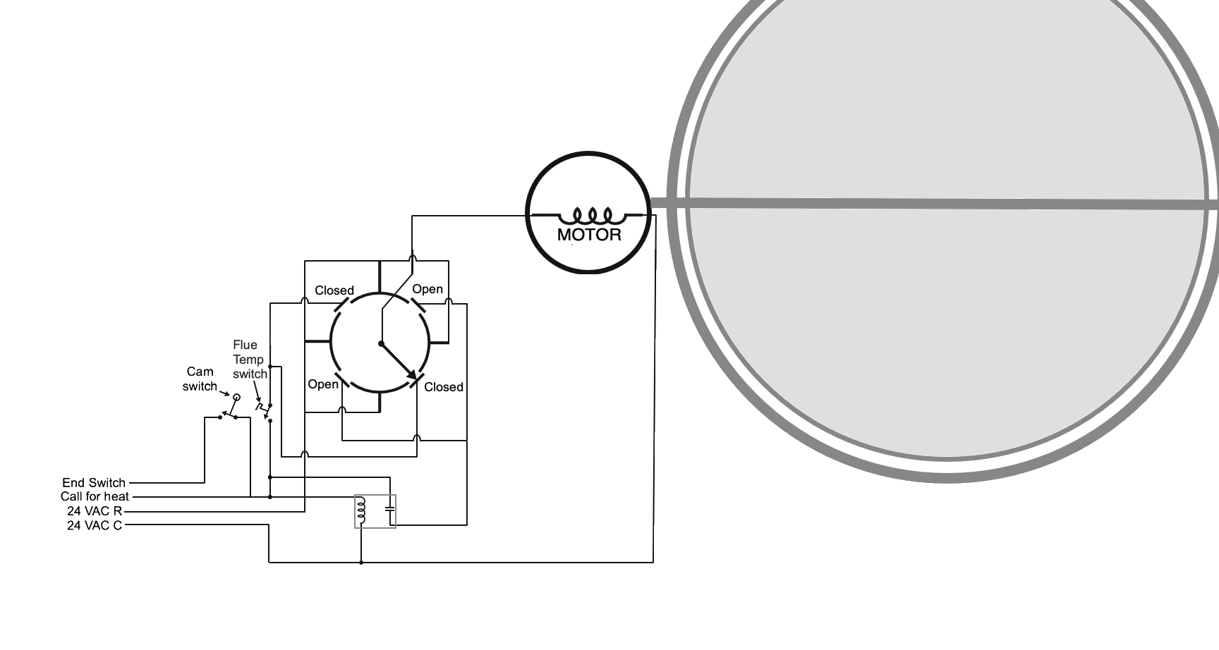 Eventually the thermal switch will close and power the open portion of the rotary switch.  The motor will start and travel to the always hot portion of the rotary switch and finally end at the closed portion of the rotary switch then stop.  The cam switch will open as soon as the damper motor starts to close the damper.