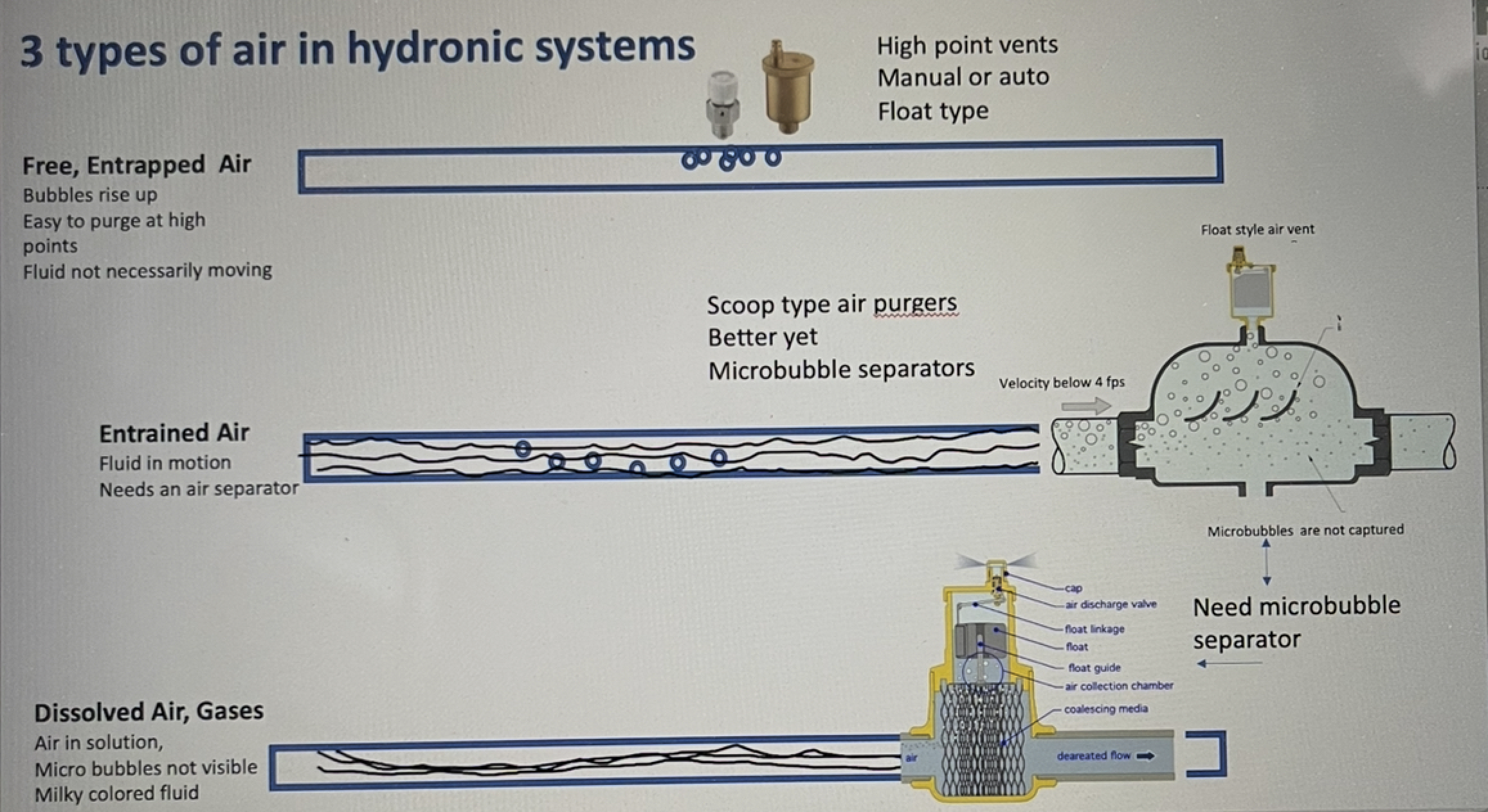 Also slow flow velocity, below 2 fps feet per second, does not carry the air bubbles along with the fluid very well. The same happens with excessive velocity over 4 fps, air rushes across a ramp type purger and does not rise up to the vent. But with that circulator and tube size I would not suspect excessively low velocity. If it is a multi speed circ, put it on the various speeds to see if that changes anything.