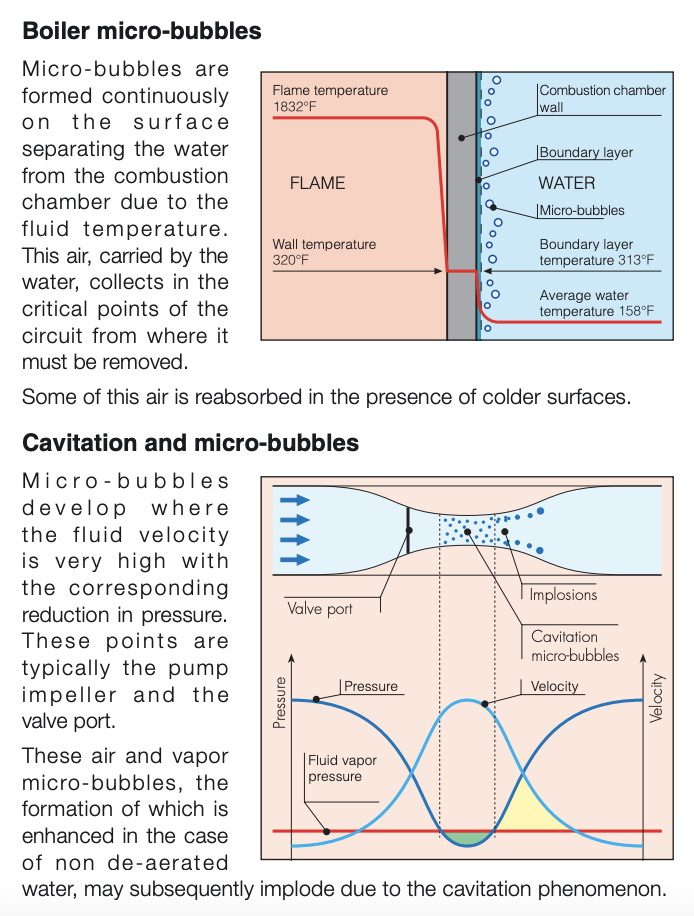 Air that is not removed goes in and out of suspension as the fluid heats and cools back down. Air forms at the hottest point in the system where the flame touches the metal surfaces in the boiler. It should flush through to the purger.