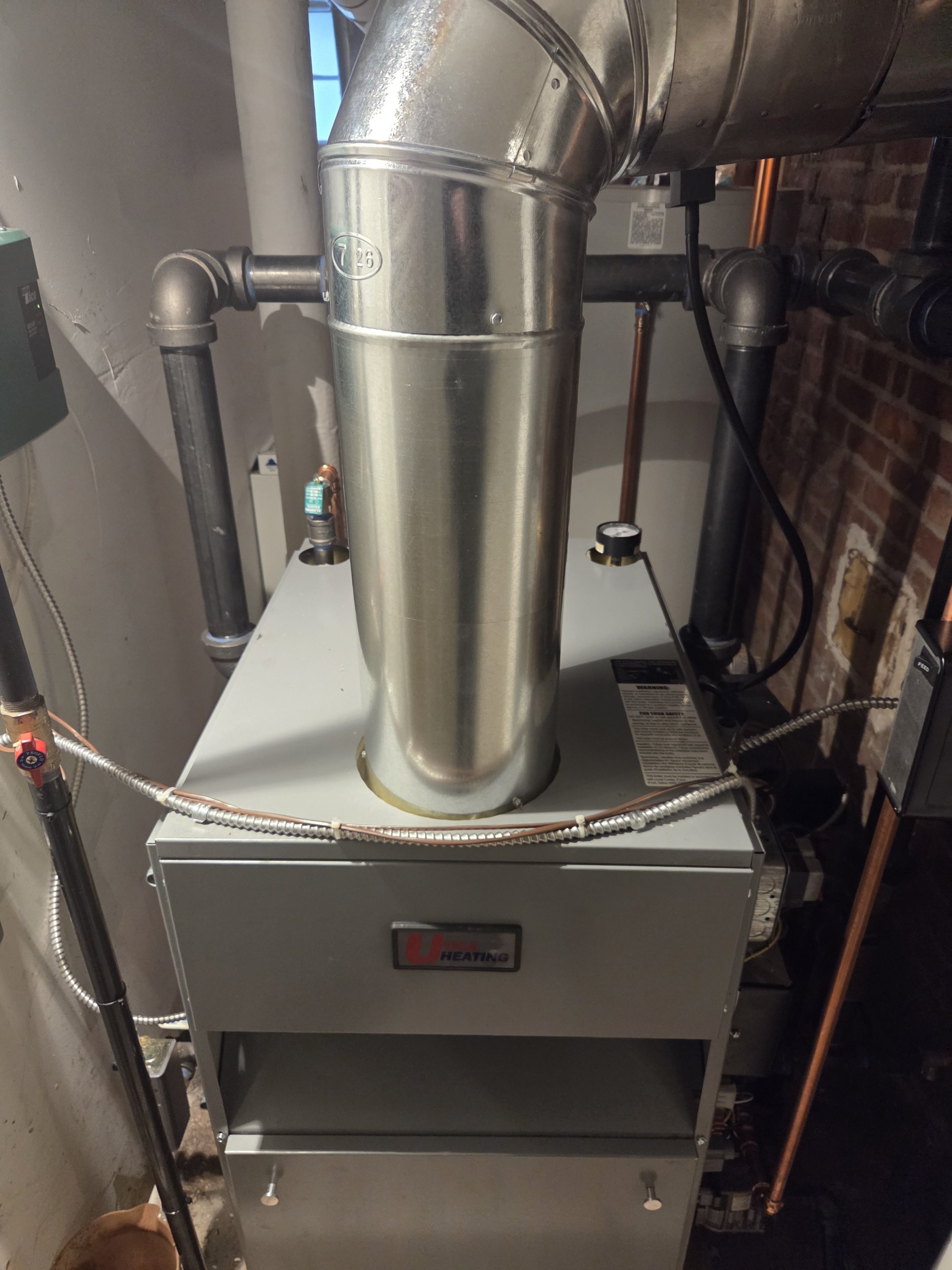 I have had a new Utica UH1606HSID boiler installed for combo single pipe steam + hot water loop heating. It is in the basement, and the flue goes into the chimney. Yes, there are separate liners for fireplace and boiler/water heater.
