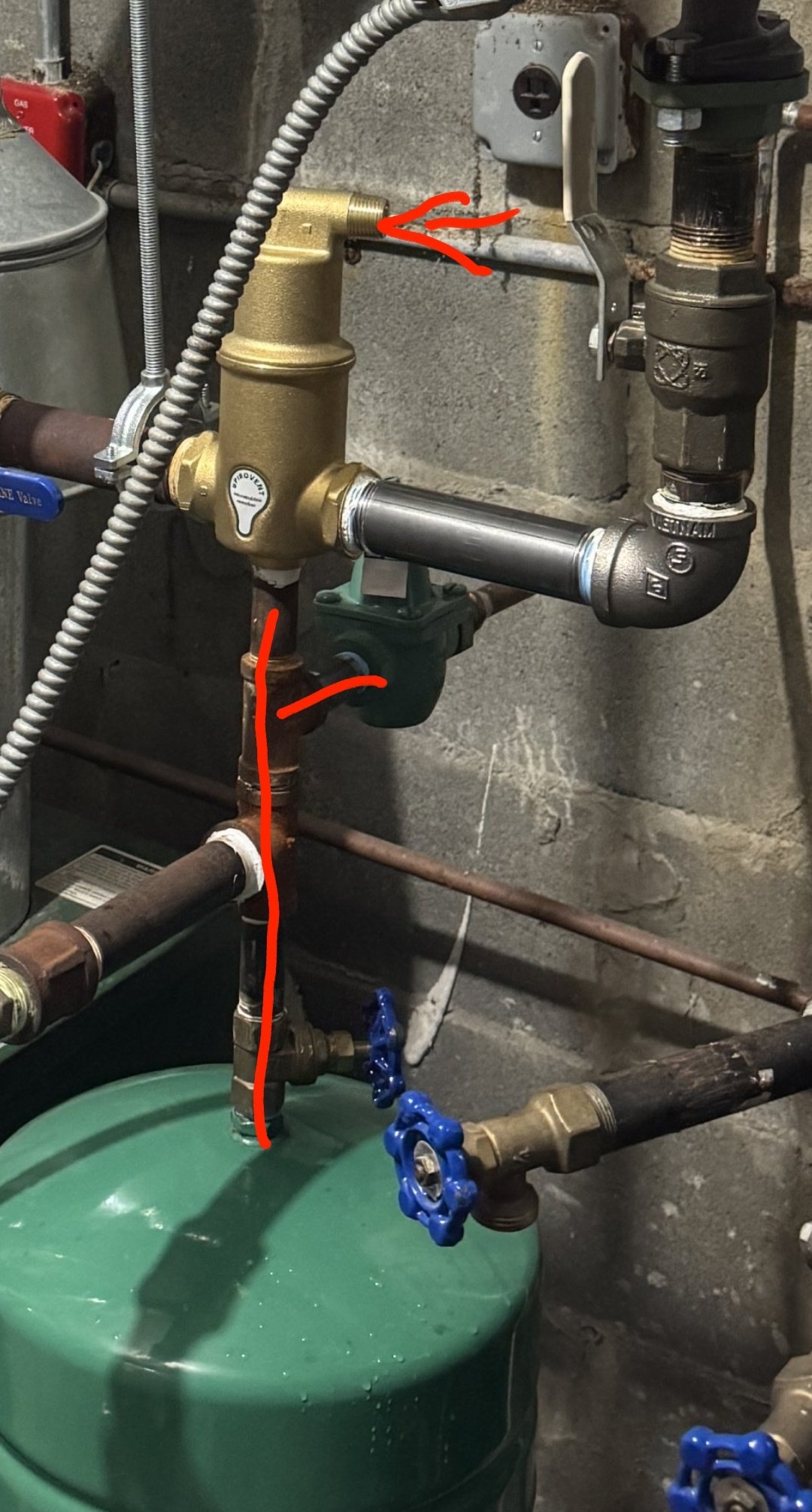 no that is the purge stn. for the next boiler over. Hard to tell but it’s this one with a white handle ball valve behind aquastat circled. Why do you see a problem here too?