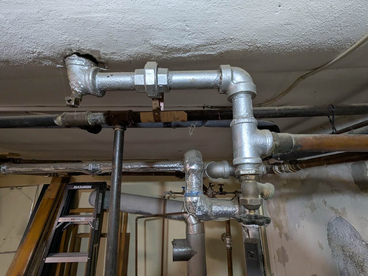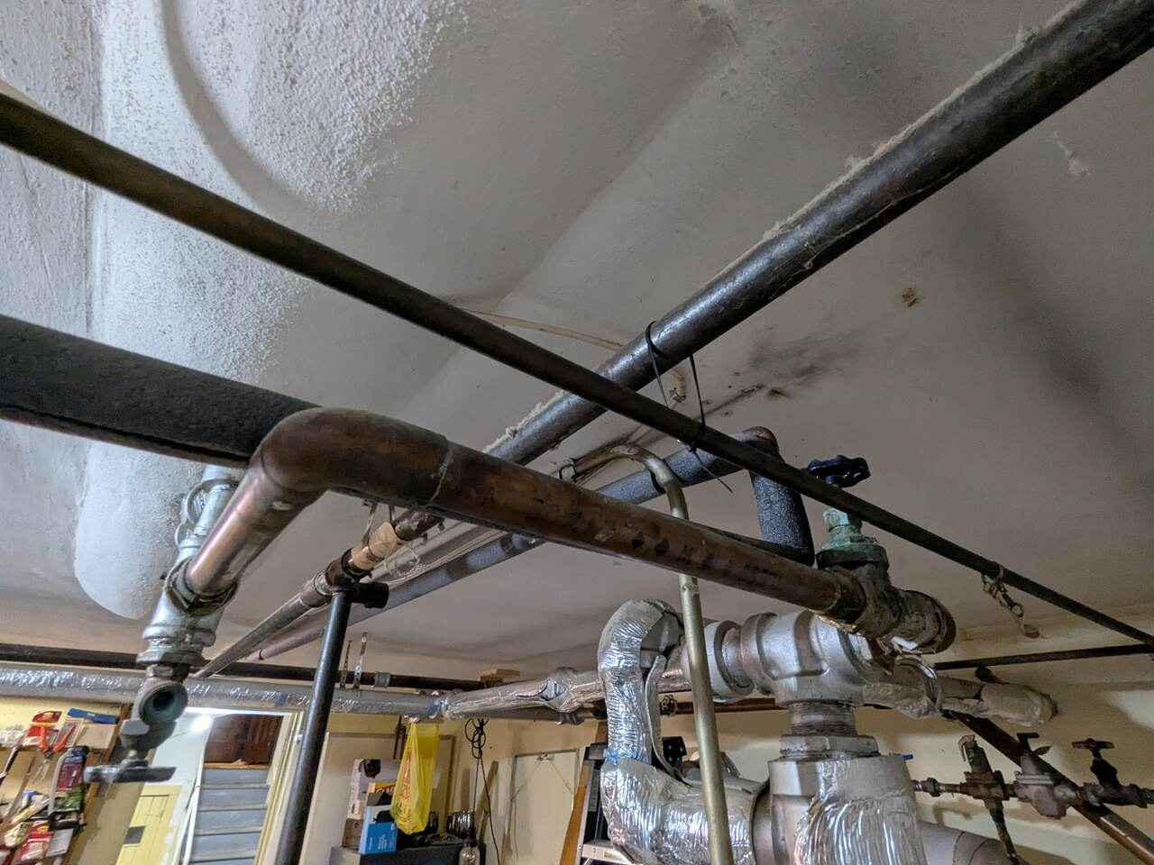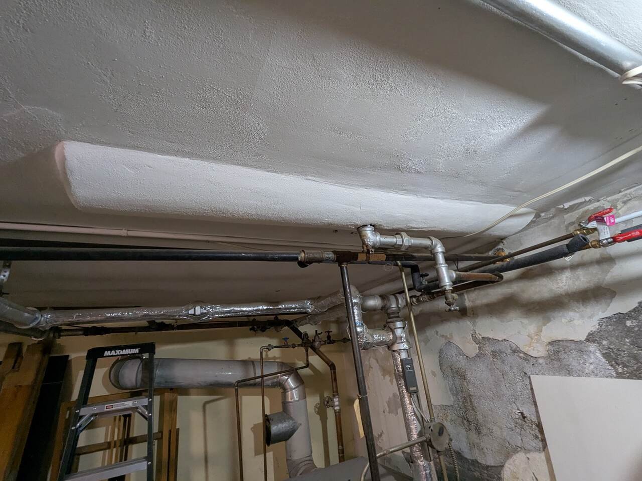 That's just the outline, there was a whole lot of detail I won't bore you with. My concern is if the tank is WATERLOGGED, I'm not going to get the pressure up. (AI suggested the boiler drain valve can be used to relieve the pressure in an emergency - I'm planning to hook up a hose). I'm wondering if the reason the system has been set to 12 psi in the first place is that the previous owners knew the tank was waterlogged and didnt want to deal with it. (It's lathe&plastered into the ceiling of the utility room - see pics)