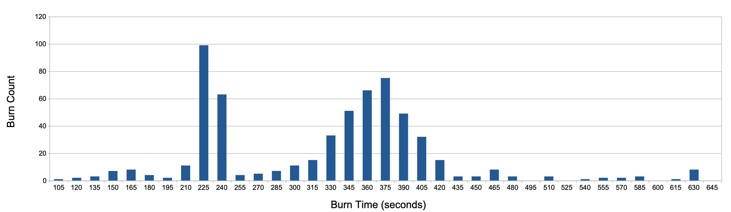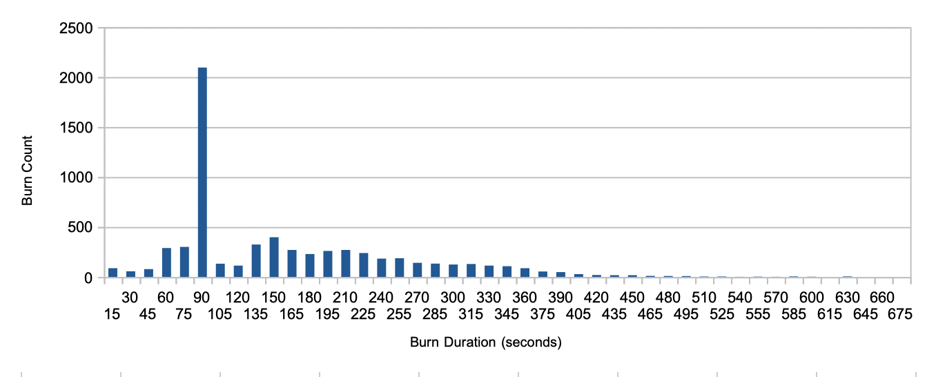 And this is what the distribution of burns looked like over the entire heating season, with those sub-90-second burns dominating: