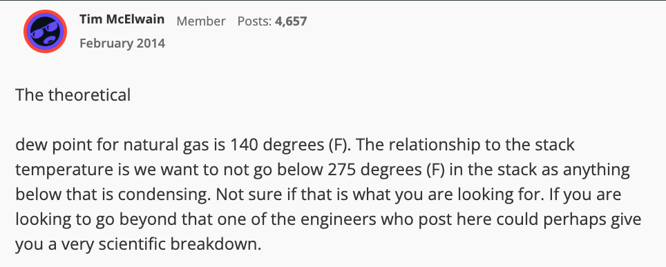I'm not sure about your condensing temperatures? It has to do with dew point of the fuel and % of CO2 in the flue gas measurement. 130°F is the number I see most boiler manufacturers suggest for NG fueled boilers.
