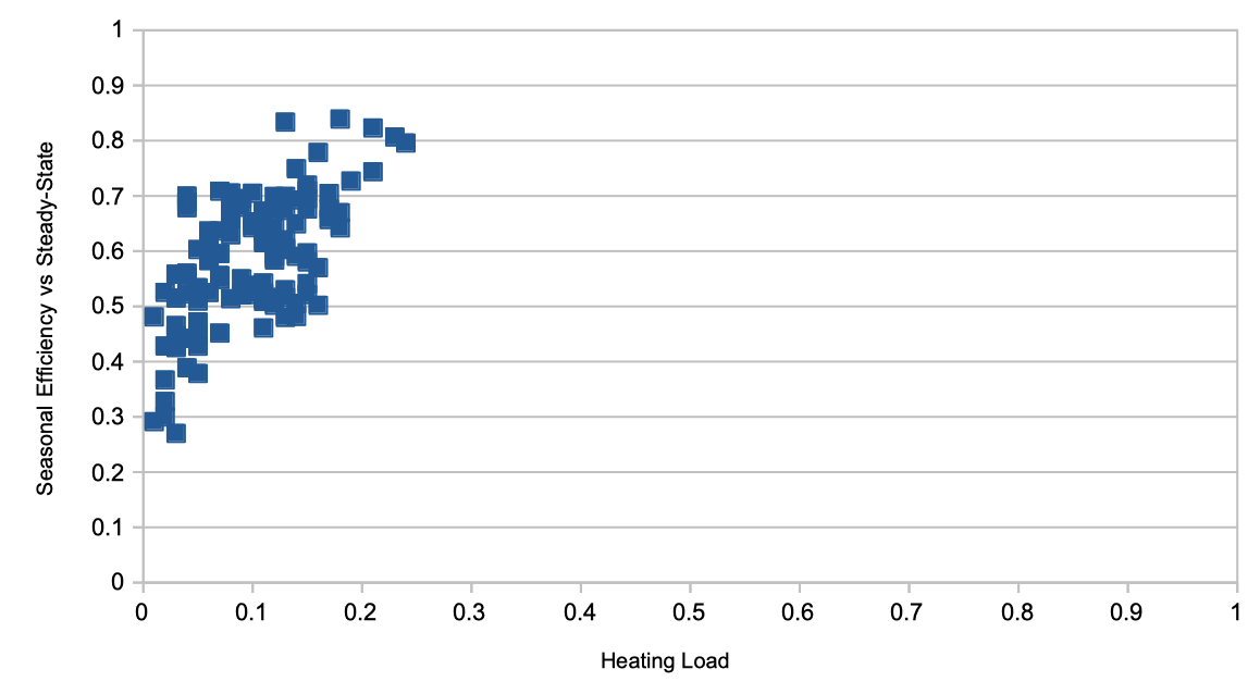 BTUs escape much easier from radiators than the boiler itself, so it's extremely effective to just keep the circulator running. Looking at the daily results from when I started tracking all of this vs now shows that there is almost no dependency on estimated efficiency vs runtime: