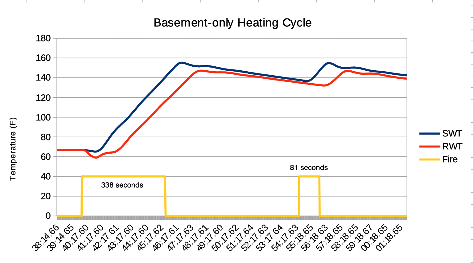 - Lowering the SWT. I can actually heat my house just fine with 140F-120F water, but it did little to address the short-cycling or getting the BTUs out of my boiler after a call for heat. It probably would actually help with the latter if I measured things carefully, as this is what 'outdoor reset' schemes are taking advantage of to increase efficiency, but I never tried lower than 160F-140F, and the purging was a much more effective way to accomplish the same thing.