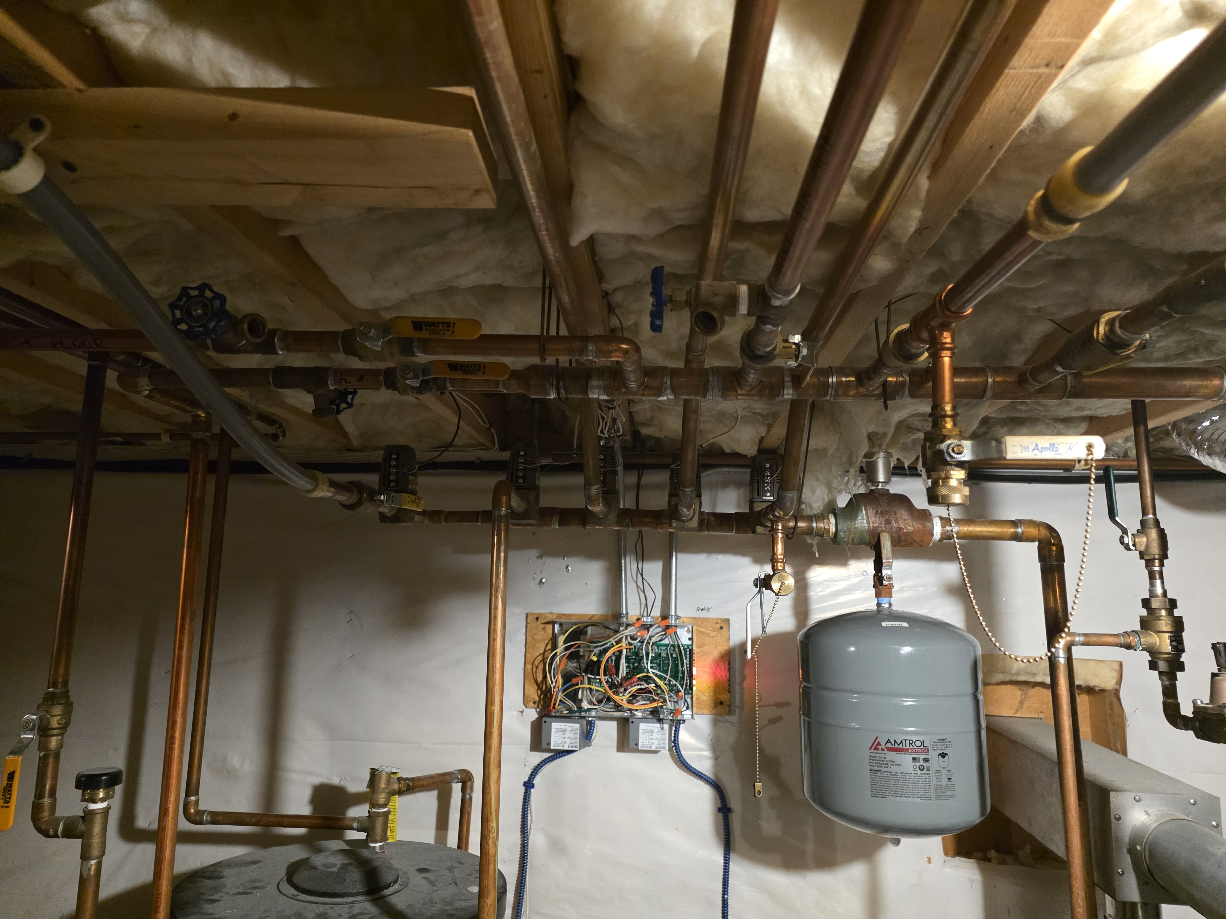 Plenty of room to upgrade the system on some warm day. A better air purger, pump to expansion tank switch, clean up some wiring at the pump and relay box. Odd to see those extra relays on the relay box?