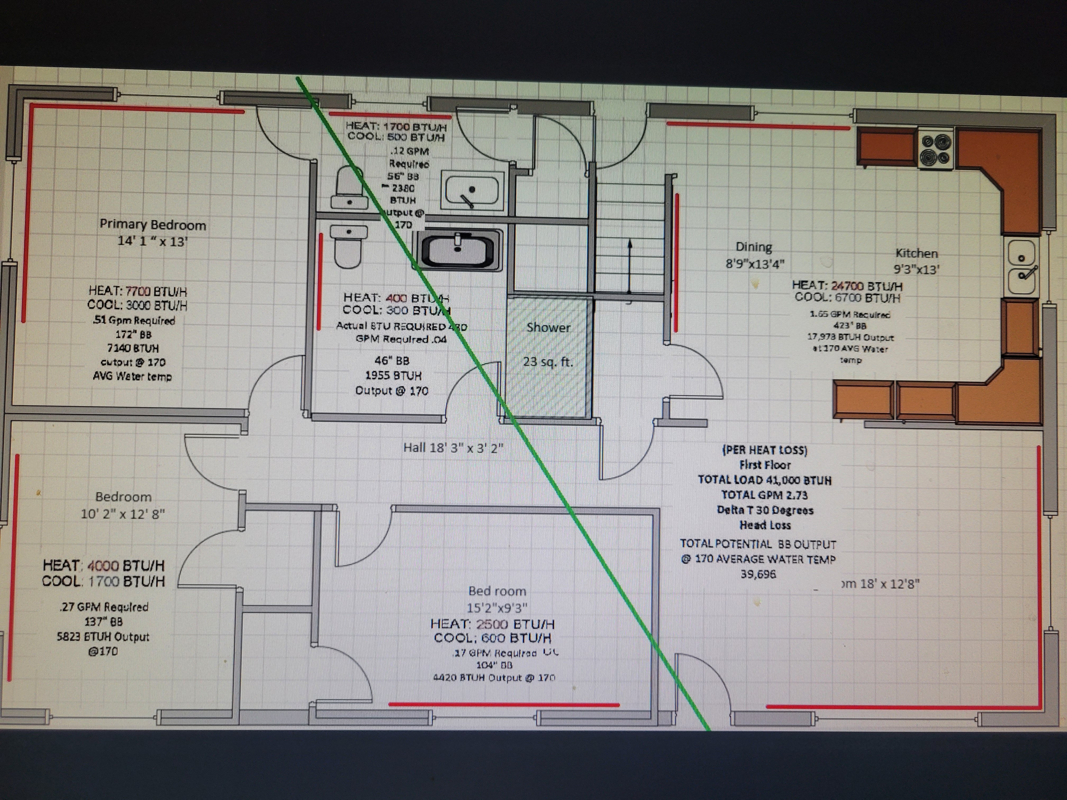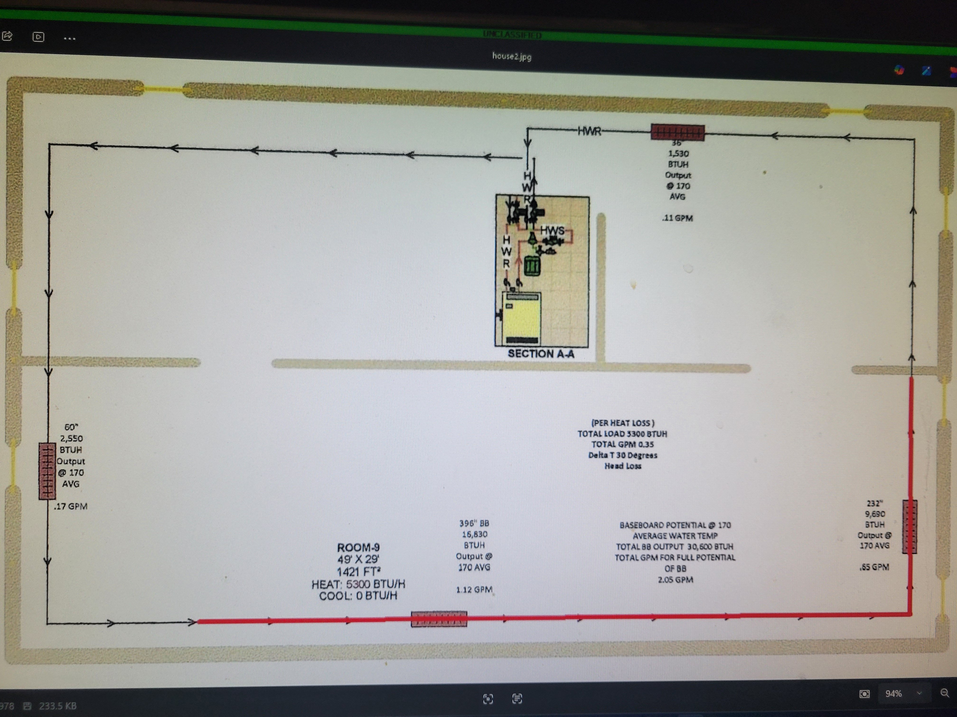 Since I have time yet, I was curious on sole options. First floor layout, total fin tube length is around 80ft which i figured was at the end of its effectiveness (70ft?). Current piping jump around and half is hidden by basement ceiling which I'll pull down this spring. I'm not sure if smaller house needs upstairs split in to zones so I'm wondering if 1 zone is priority DWH, can the 2nd zone be split to run parallel both sides of the house? (Green line) splits it evenly at 40ft each side. 1.25 to split 3/4's and return to 1.25 amd water stays hot?