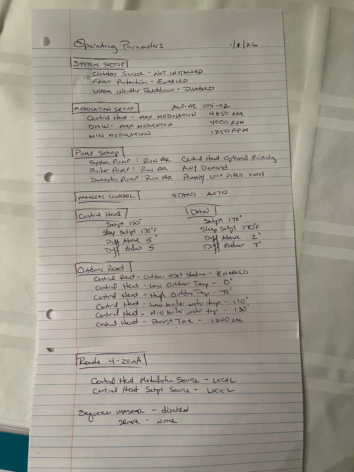One thought - it seems like the radiant is constantly calling for heat, as if the temperature in the tubing isn’t sufficient to heat the room. This is causing the boiler to be running almost constantly. The Central Heat set point is at 150 - as it’s always been. I was wondering if it made sense to raise the set point to the same as the DHW (170)?
