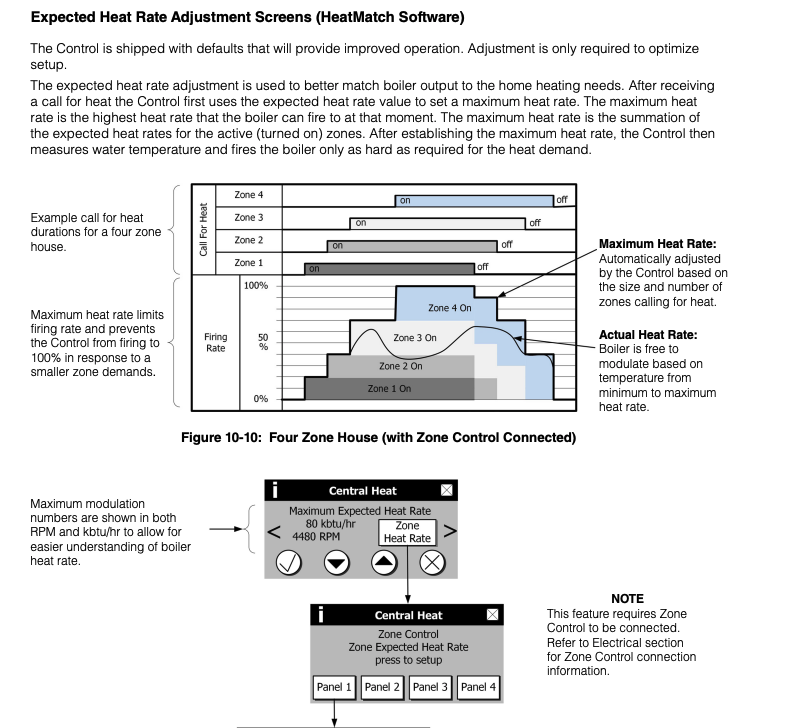 @hot_rod posted some pages from the boiler manual. You should be aware that there exists an optional Sage Zone Control device. It is my understanding that zone by zone maximum heat rate parameters are not accessible unless using the boiler in conjunction with the Sage Zone Control. But you should be able to set a boiler maximum firing rate that caps the maximum output regardless of which zones are calling. Is there a "Modulation Setup" button on the screen anywhere?