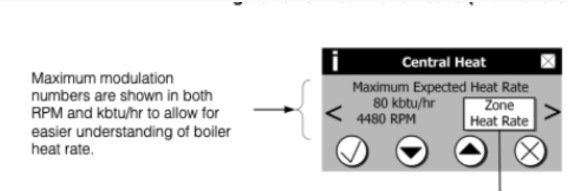 Use the down arrow to crank the rpm/ btu down to 1/2 of what it is now. If it is 4480 rpm, take it down to maybe 2500. It should then show what the boiler BTU output will be at that limited RPM, example below.
