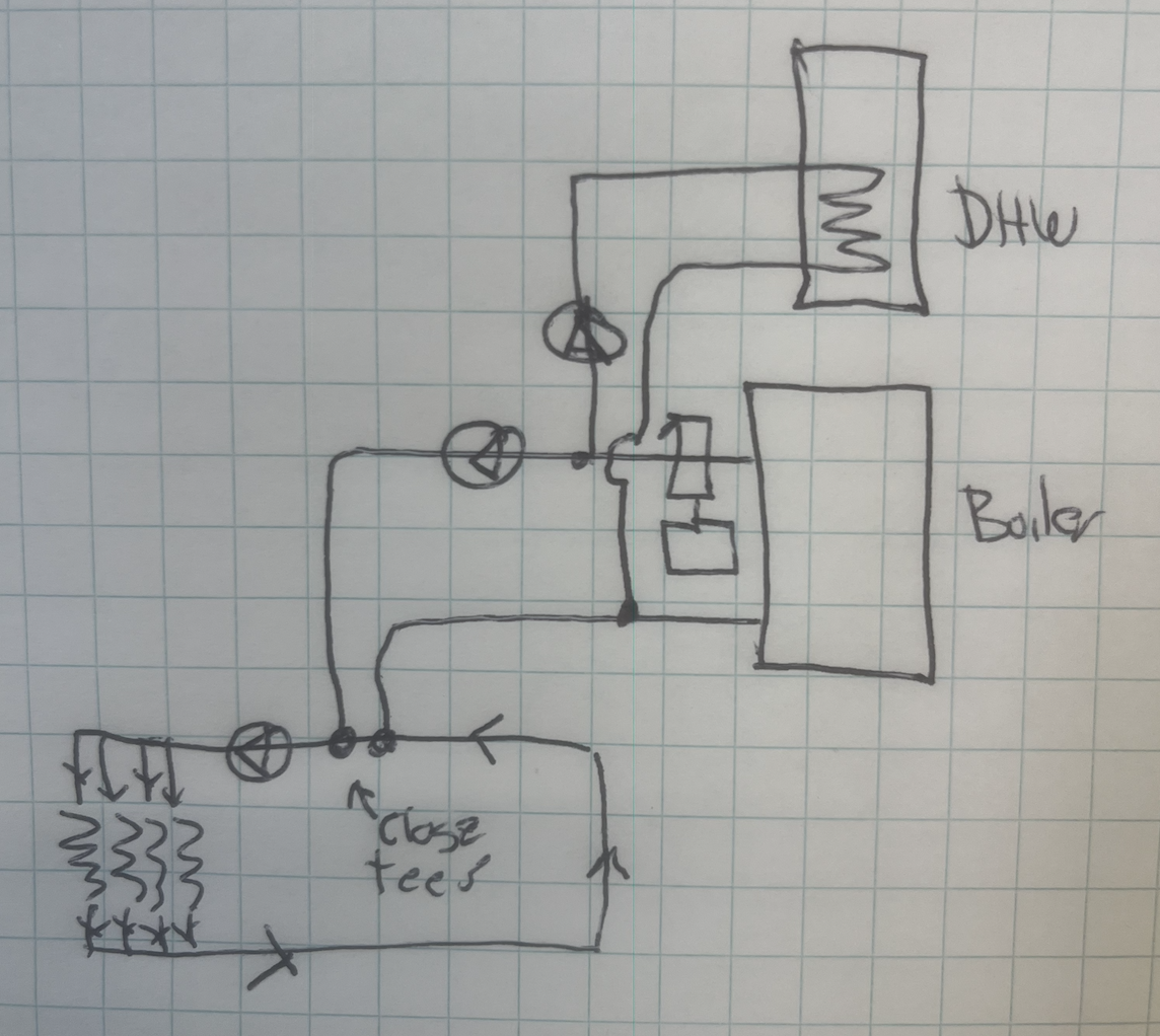 If this is the case, I see aloop thru the boiler, with an odd use of tees, but it should flow. Then the blue arrows are the system loop. Red arrows are the boiler loop