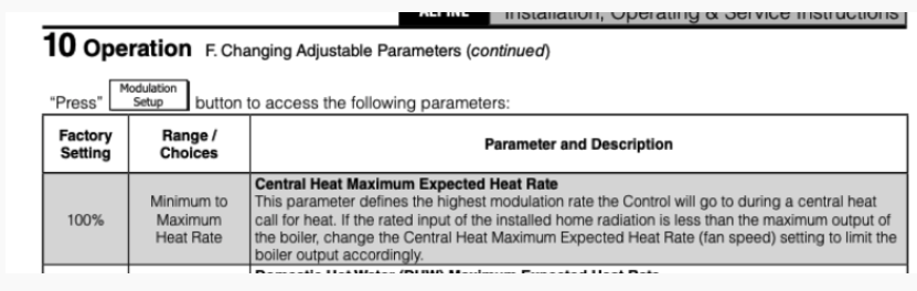 Second, the burner on this system modulates. How does that come into play? For starters, most boilers that modulate will allow you to cap the maximum burner output. On this system, the central heat RPM parameter adjust the maximum burner output for calls from the radiant loops. There is also a separate max burner parameter dedicated for domestic hot water calls. Lowering the burner output is kinda like replacing the boiler with a smaller model.
