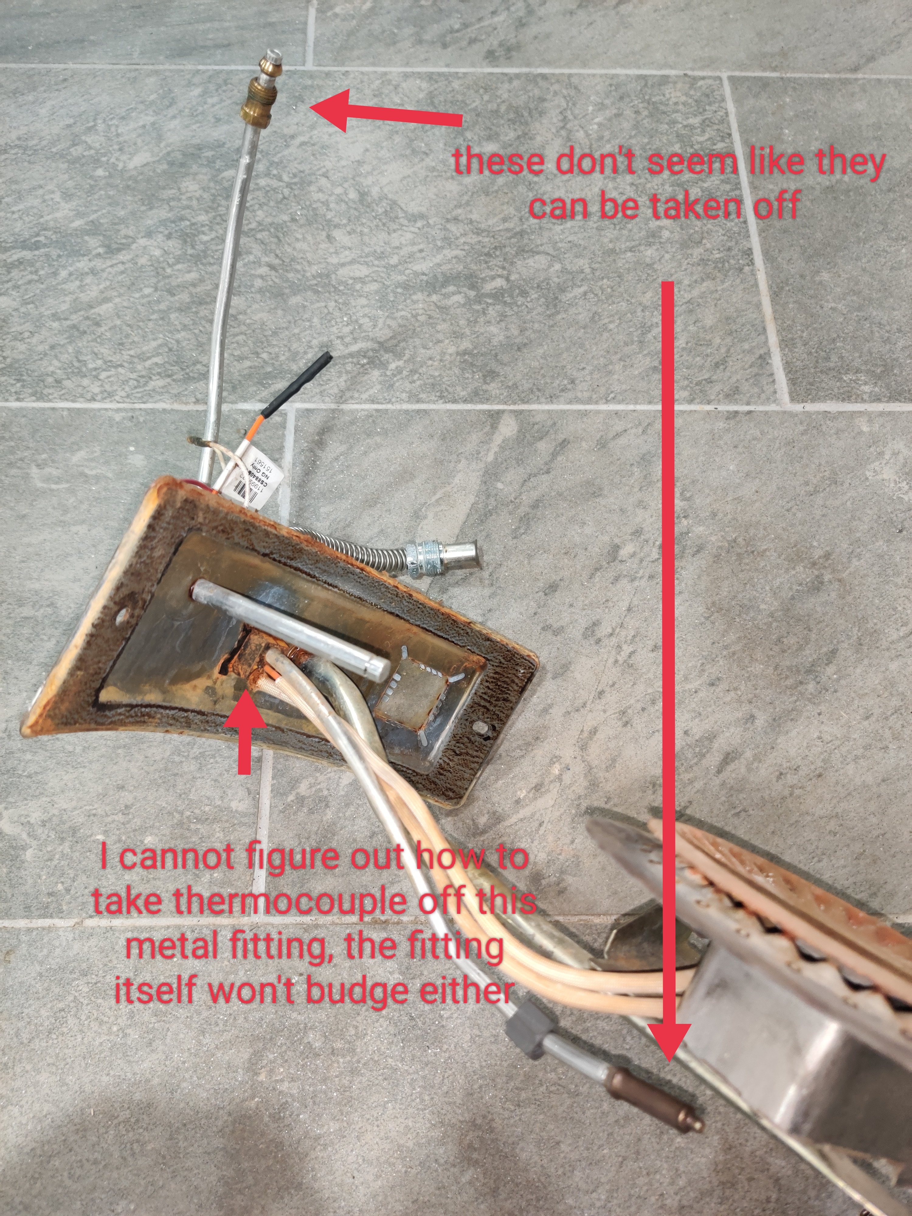 I have an old thermocouple from an AO Smith water heater I want to salvage. I am not able to remove it or the black metal fitting hold it. Could you please advise how I should proceed?