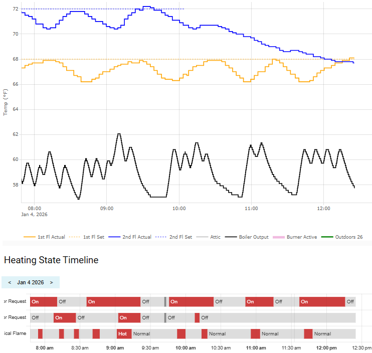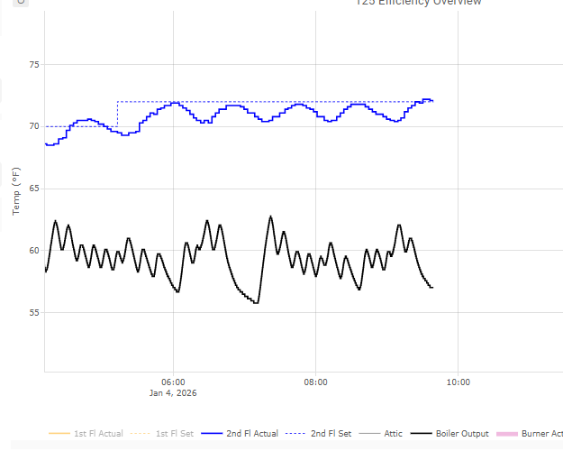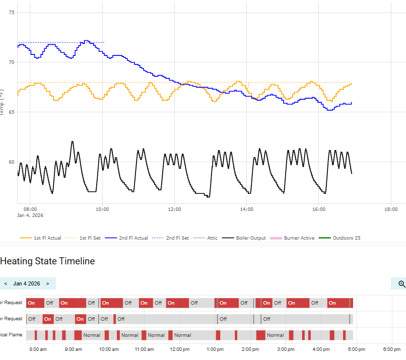 Two thing I note is that the 1st fl is never reaching the setpoint and the frequent firing/not-firing of the boiler. A week ago the boiler had no trouble getting the temp in the 1st fl zone to hit the setpoint.