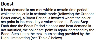 That "Boost" feature is interesting. From my basic and initial read, it sounds like the controller is in Setback mode. But, I don't know if that is possible without an outdoor reset.
