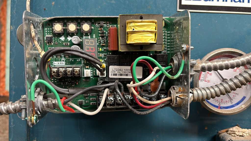 Allowing the BX cables to sweep upward allows for an unobstructed view of the pressure gauge for the boiler as well and eliminate excess strain on the conductors and ground wires.