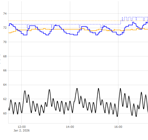 This graphs is characteristic of what I am working with. Black line is the temp from a gauge hanging in the air a couple inches from the exhaust pipe of the boiler (the absolute valves are worthless, but the relative valves and the rate of change indicate whether the boiler is firing). Orange solid is the temp in 1st fl zone. Orange dash is 1st fl setpoint. Blue solid is temp in 2nd fl zone. Blue dash is 2nd fl setpoint.
