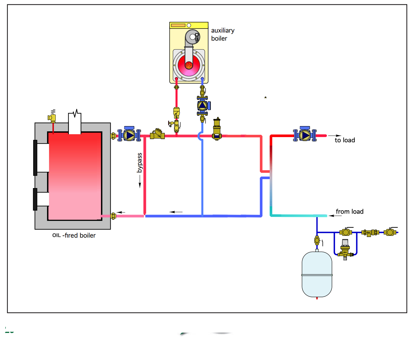 If the boilers are 100' apart that complicates things. You want to sent heat in either direction based on ?? cost of fuel,, failure of the oil, backup or redundancy??