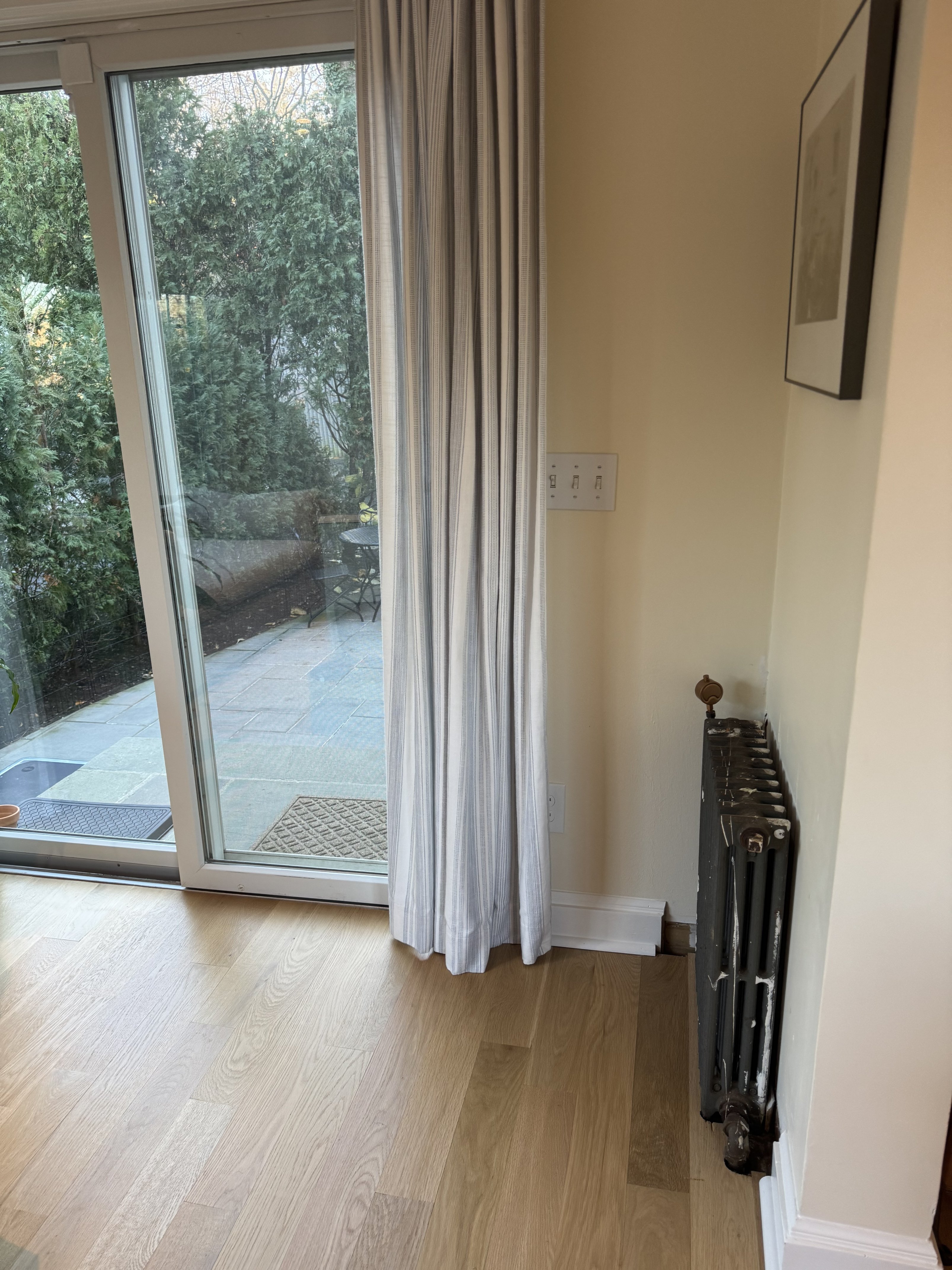 Behind/below the two small steam radiators (which are normally covered by metal radiator enclosures), there are big gaps between the floor boards and the drywall. These gaps allow a tremendous amount of cold air into the entryway. On cold days, when the radiators aren't steaming, you can really feel the draft coming in from those locations.