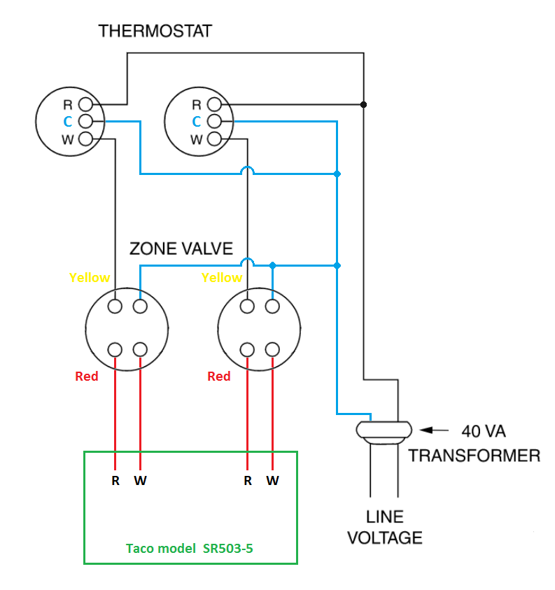 @109A_5 said: "If your Taco SR503-5 has the optional additional transformer for the additional loads of the zone valves and powered thermostats. You could do it this way."