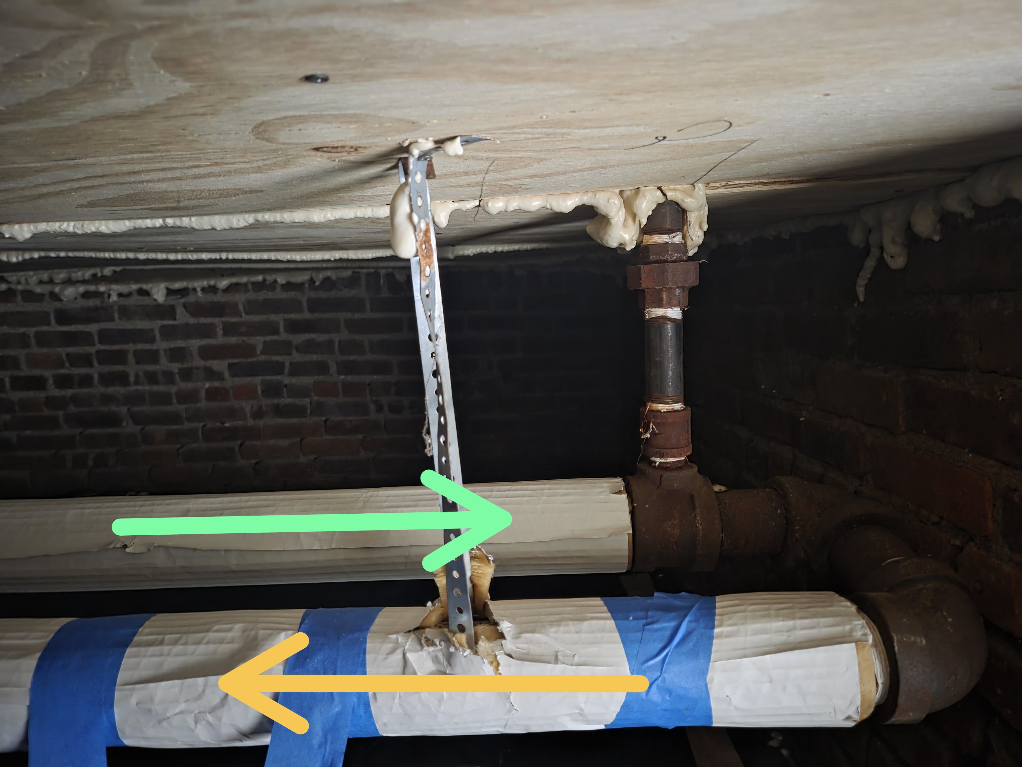 What is the direction of steam flow? Is that a dry return in the foreground? How many radiators are on this main? How long is it? Is there no vent anywhere on this main? If there is one, where is it?