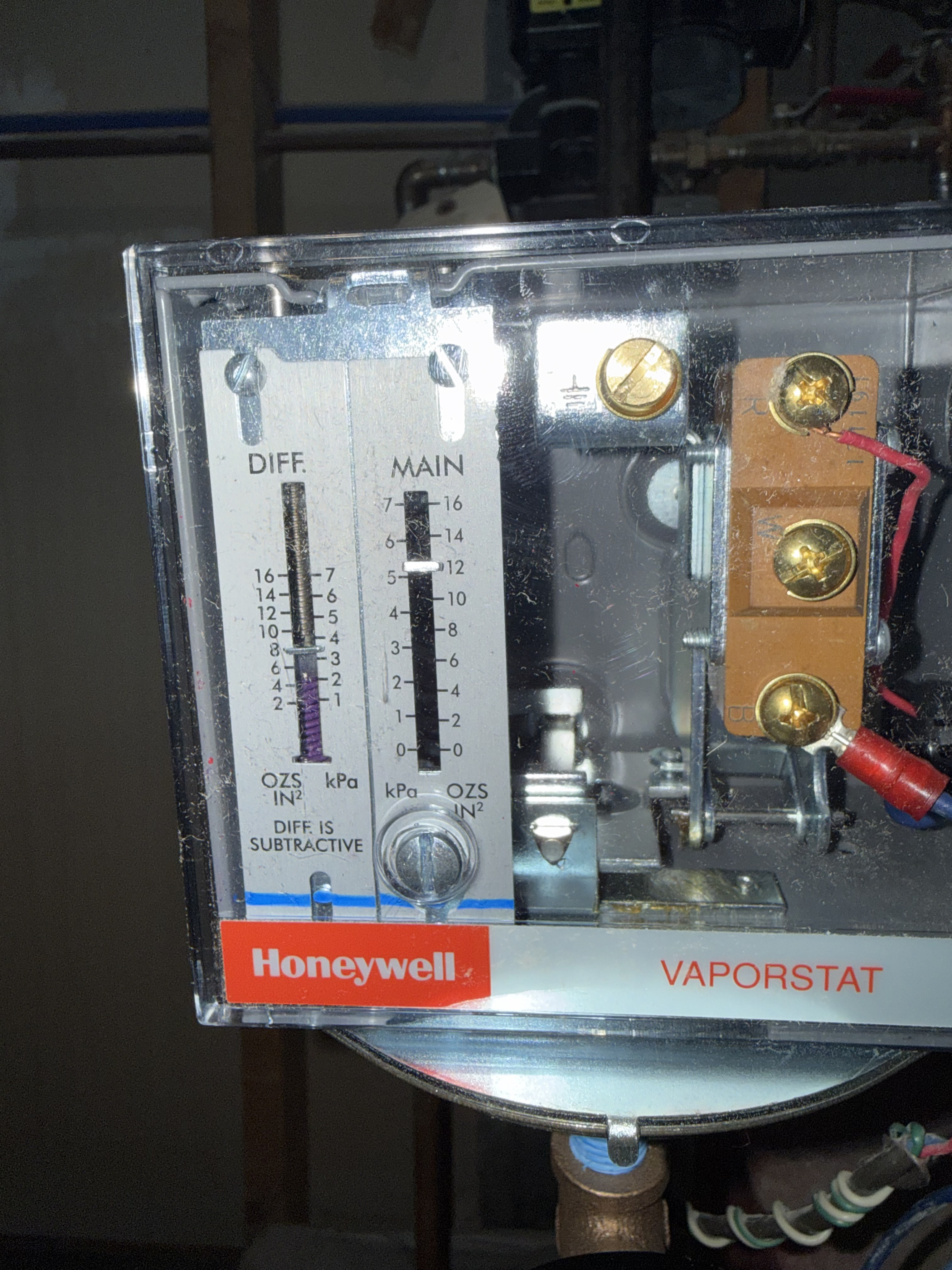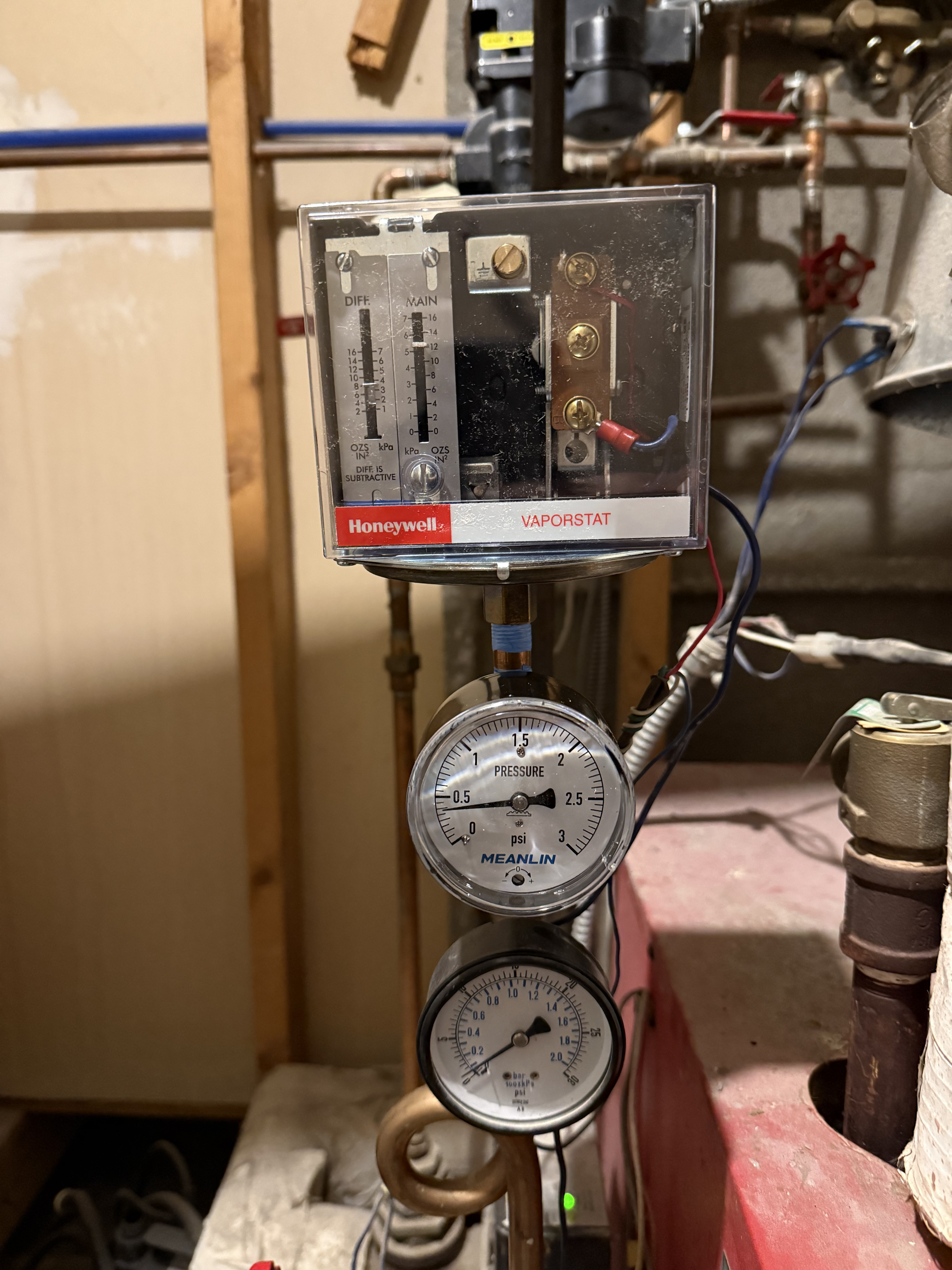 New vaporstat and 0-3 gauge installed. System is now reliably cutting out at just above 1 psi and back in at .5 psi.