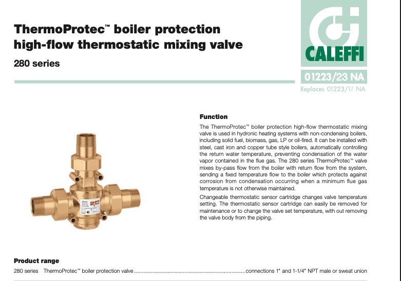 This valve developed specifically for the wood boiler industry, has a high flow rate, simple installation. temperature gauge wells at all 3 ports to monitor what it is doing. It is generally used as return temperature protection, but can also be used in a diverting function.t